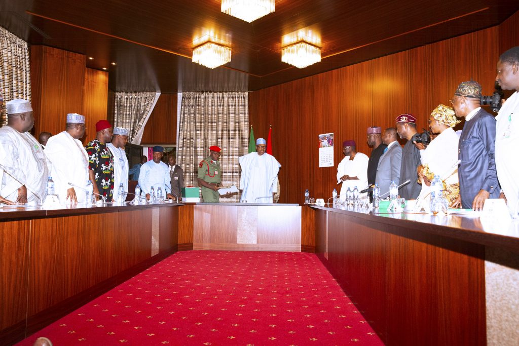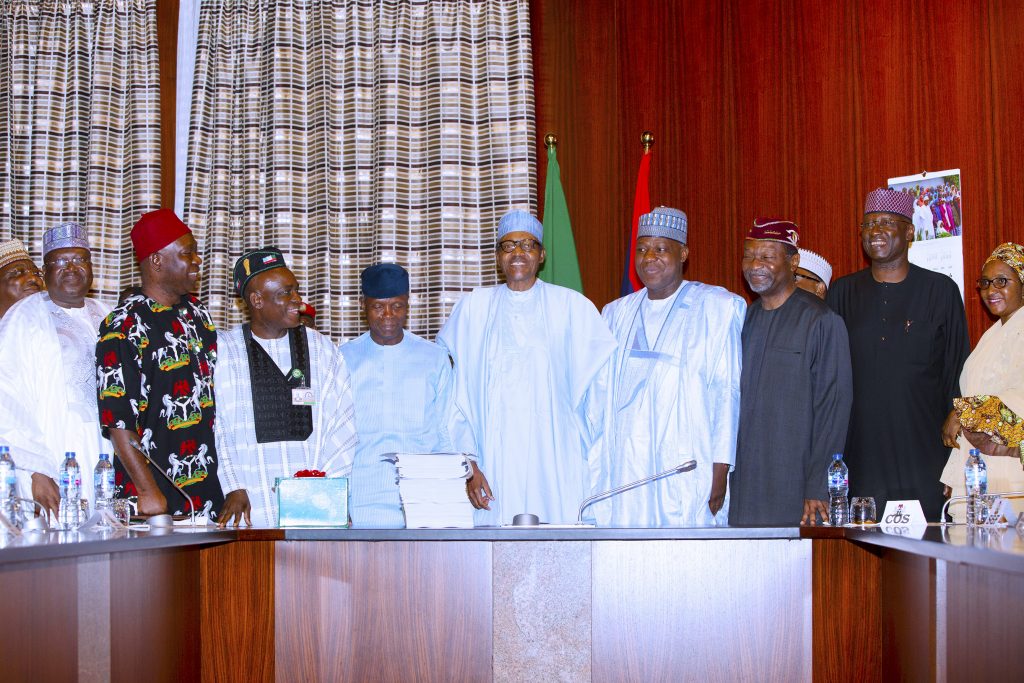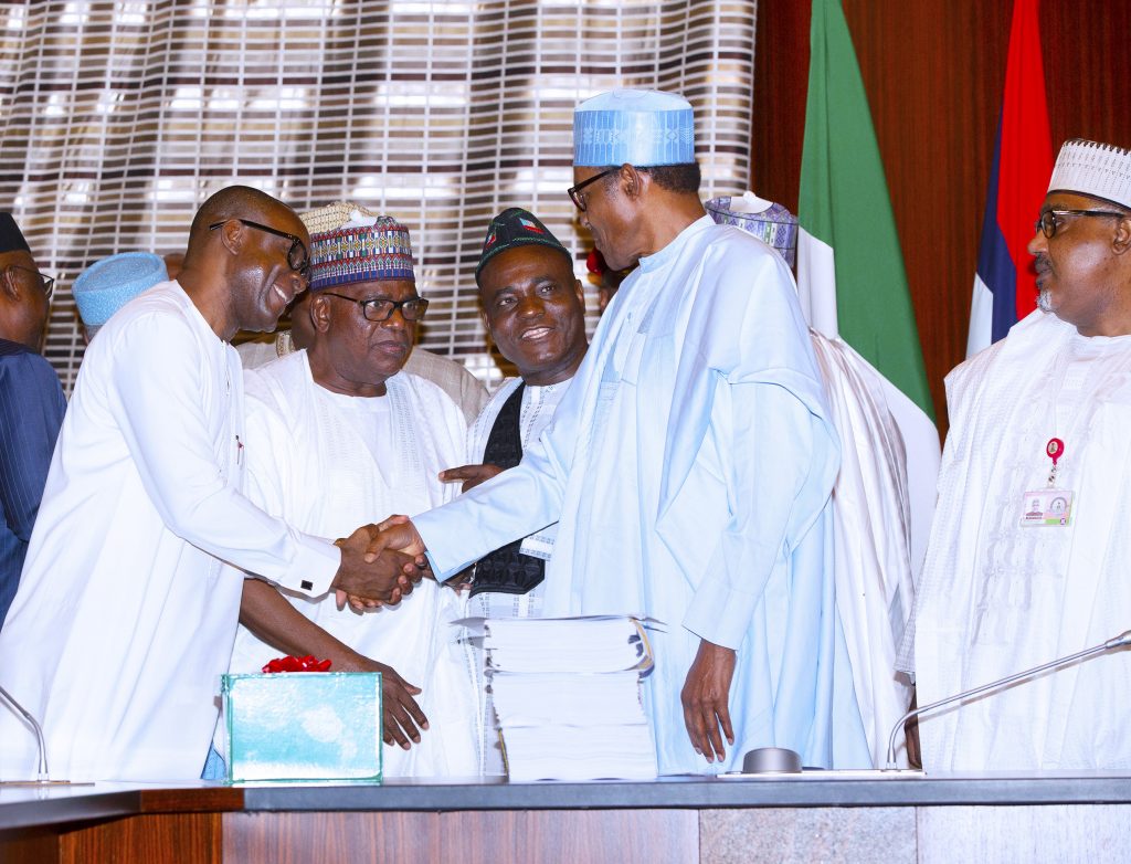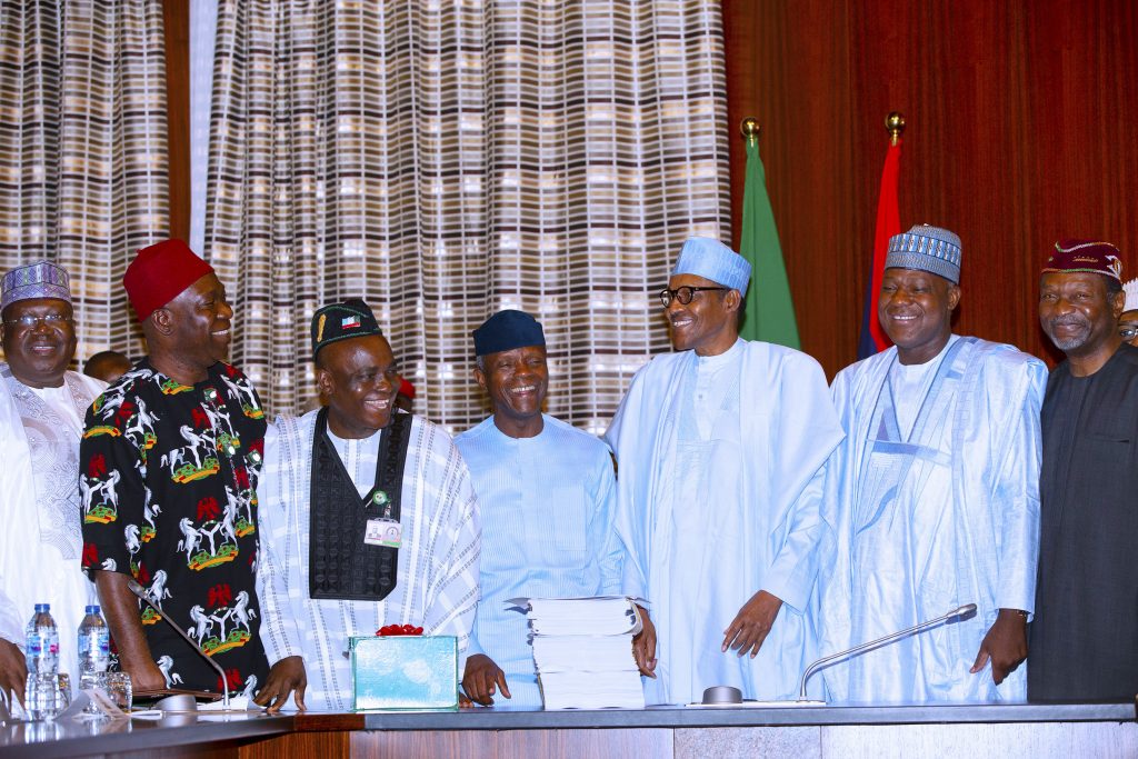 R-L; Minister of Budget and National Planning, Senator Udoma Udo Udoma, Speaker Rt Hon Yakubu Dogara, President Muhammadu Buhari, SSAP NASS (Senate), Senator Ita Enang, Deputy Senate President Sen Ike Eweremadu and Senate Leader Senator Ahmed Lawan