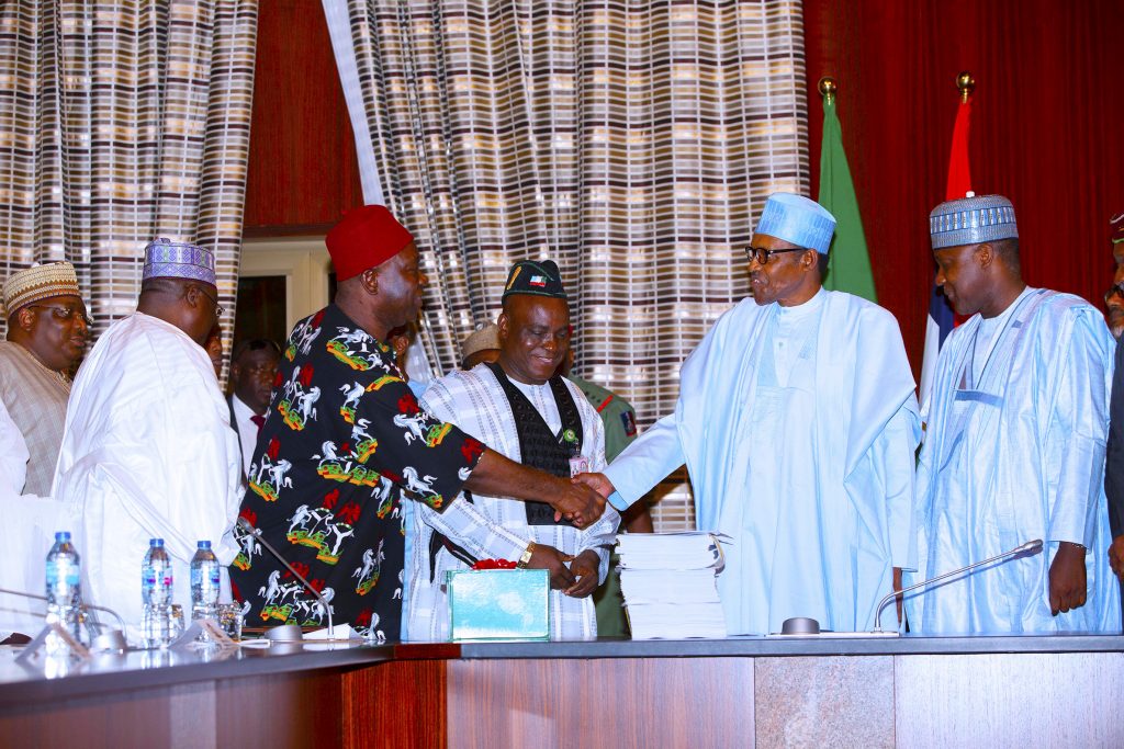 President Muhammadu Buhari in a handshake with the Deputy Senate President Ike Eweremadu. Others are Speaker Rt Hon Yakubu Dogara (Right), SSAP (NASS) Senator Ita Enang and Senate Leader Senator Lawan Ahmed