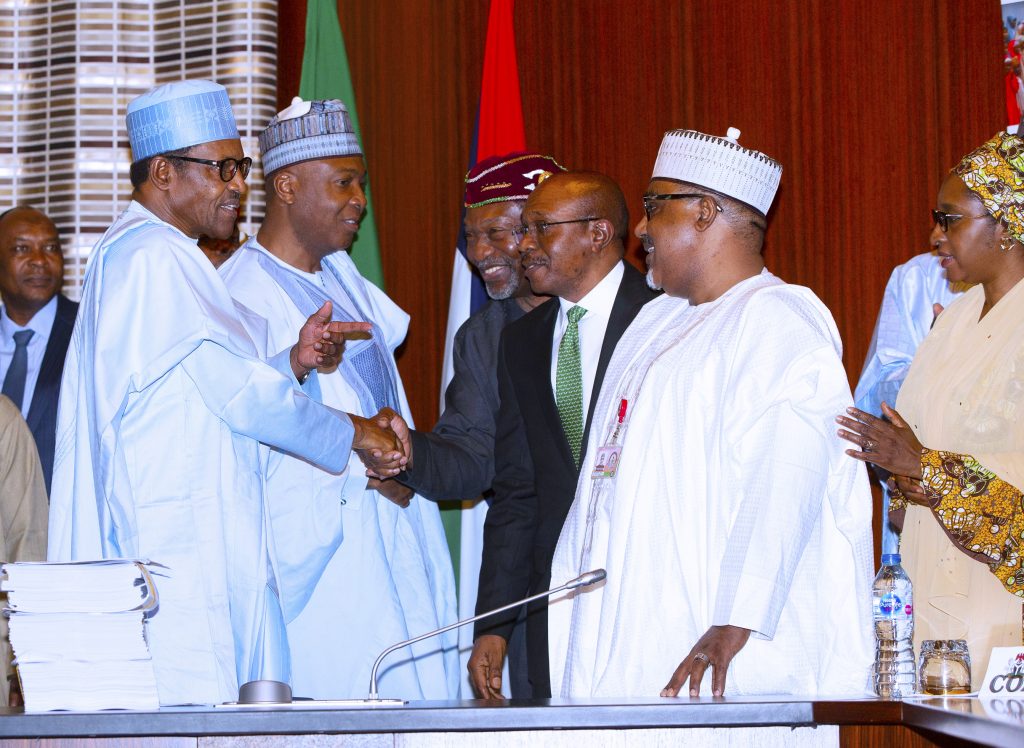 President Muhammadu Buhari in a handshake with the CBN Governor, Mr. Godwin Emefiele, Others are President of the Senate Dr Bukola Saraki, Senator Owan-Eno. Senator Danjuma Goje, Minister of Finance, Zainab Ahmed and SSAP (REP) Hon Umar El Yakubu