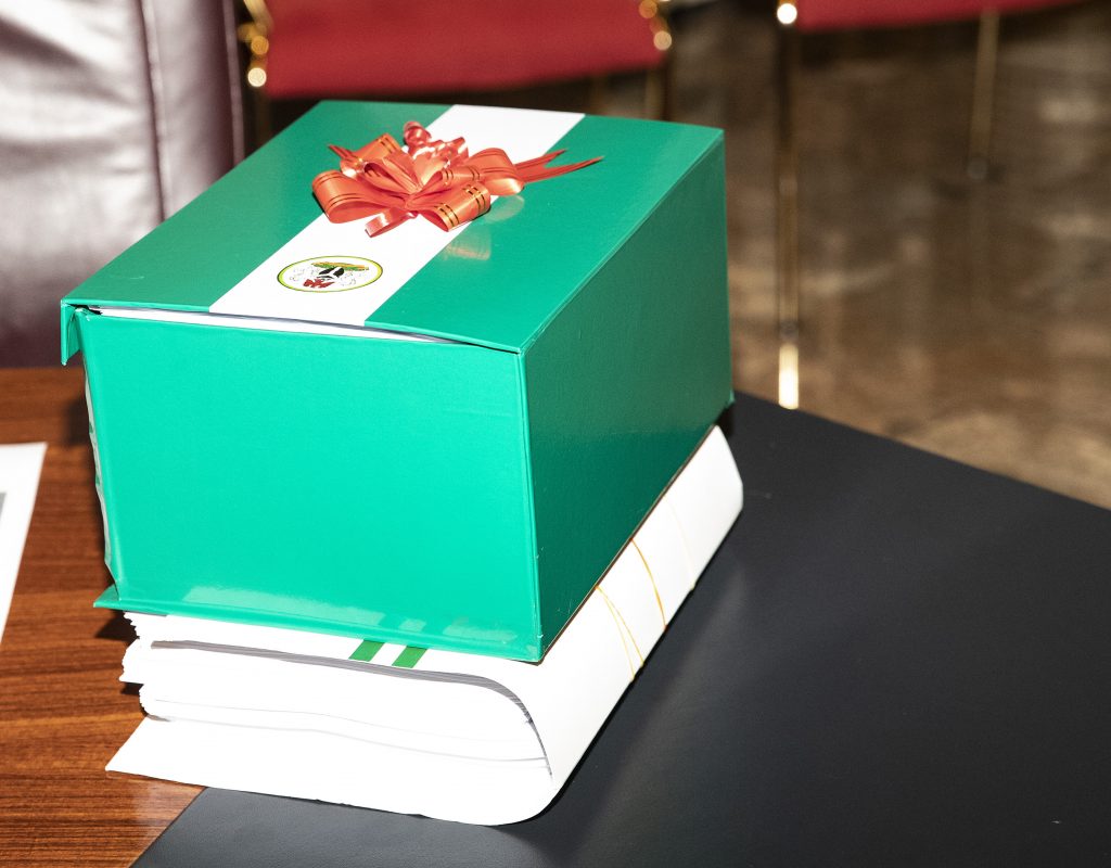 President Muhammadu Buhari signs the 2019 Budget flanked by SSAP NASS (Senate), Senator Ita Enang and SSAP (REP) Hon Umar El Yakubu