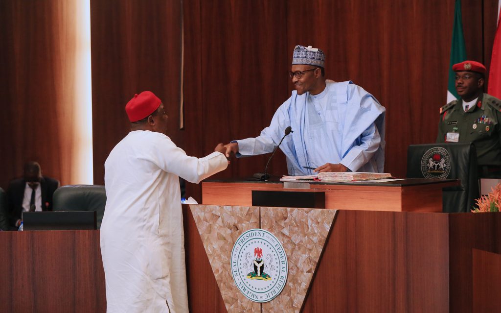 PRESIDENT BUHARI SWEAR-IN RMAFC MEMBERS 4. President Muhammadu Buhari in a handshake with the Chairman Revenue Mobilisation, Allocation and Fiscal Commission, Engr Elias Mbam during the swearing-in of Chairman and Commissioner of the Commission held at the State House, Abuja. PHOTO; SUNDAY AGHAEZE. JUNE 27 2019