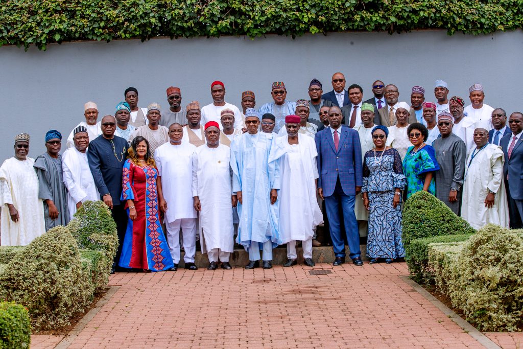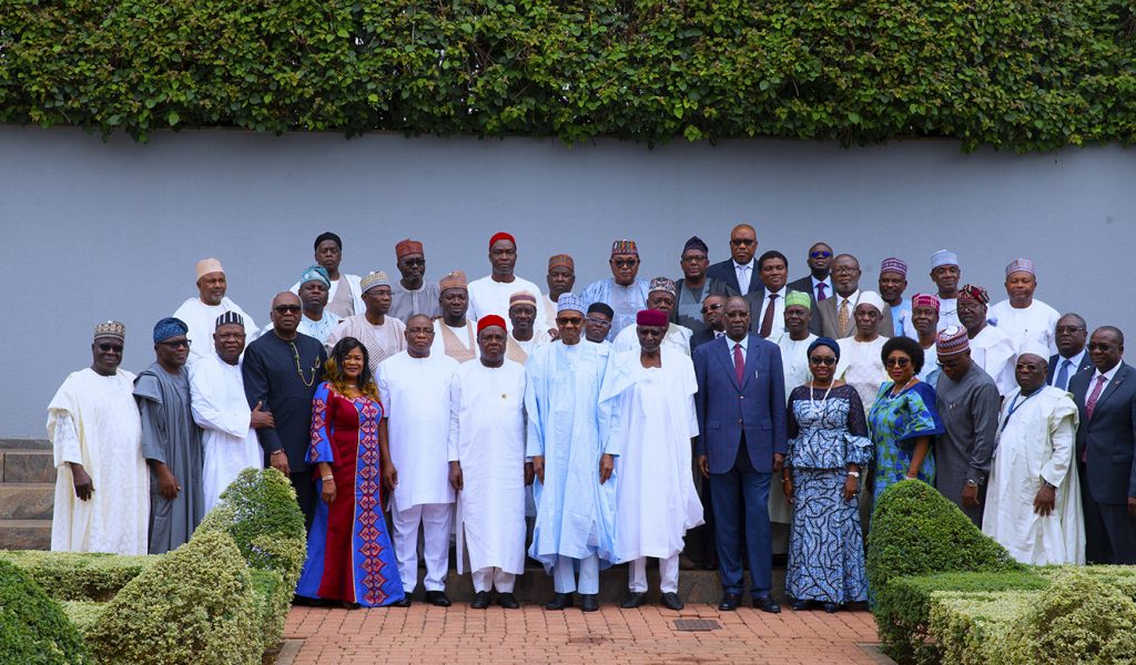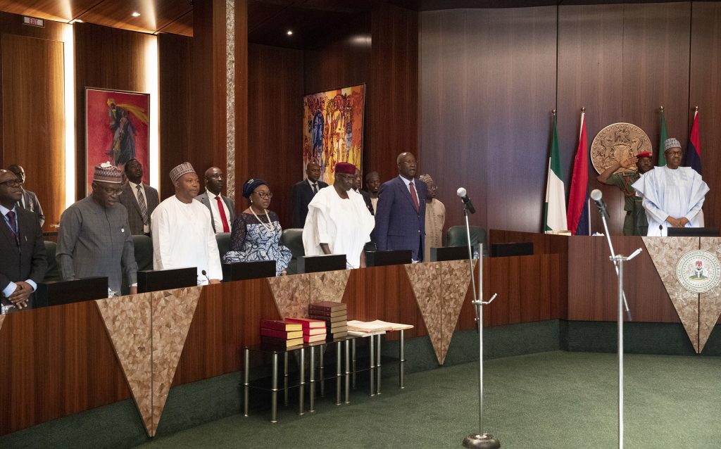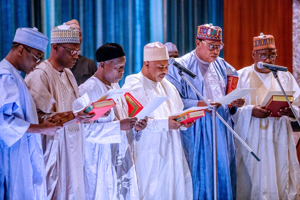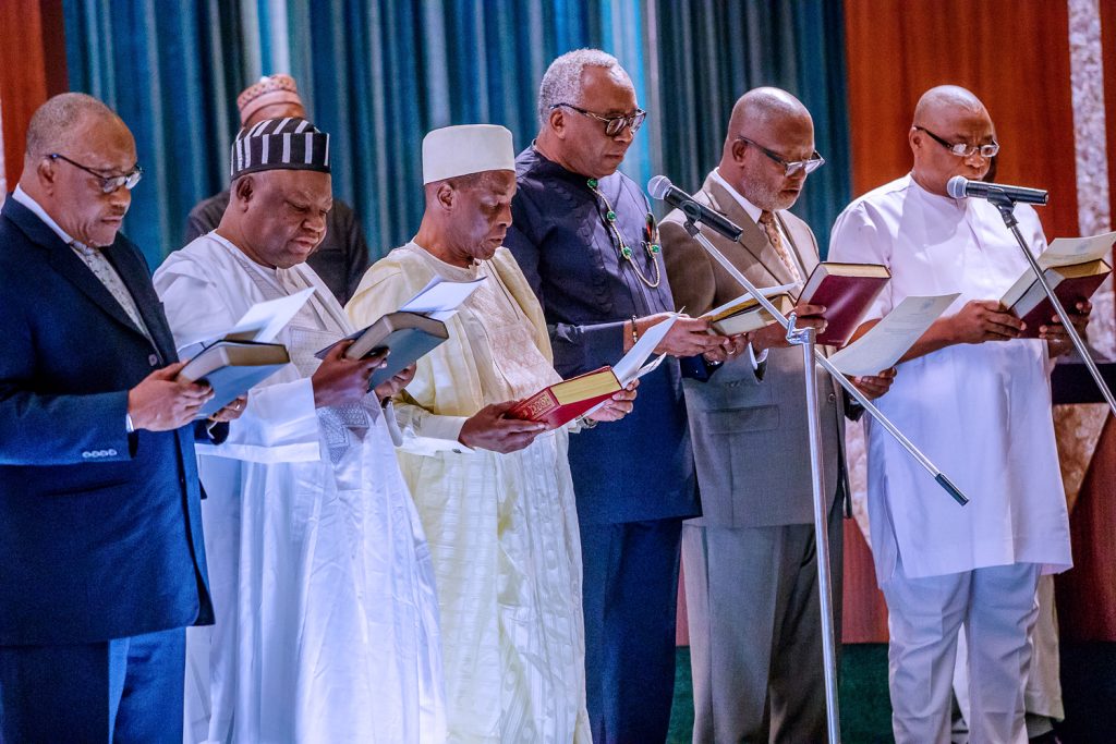 PRESIDENT BUHARI SWEAR-IN RMAFC MEMBERS 2. President Muhammadu Buhari, SGF Mr boss Mustapha, Chief of Staff Mallam Abba Kyari, Head of Service, Mrs Winifred Oyo-Ita, Permanent Secretary State House, Ajala Arabi and others during the swearing-in of Chairman and Commissioner of the Commission held at the State House, Abuja. PHOTO; SUNDAY AGHAEZE. JUNE 27 2019