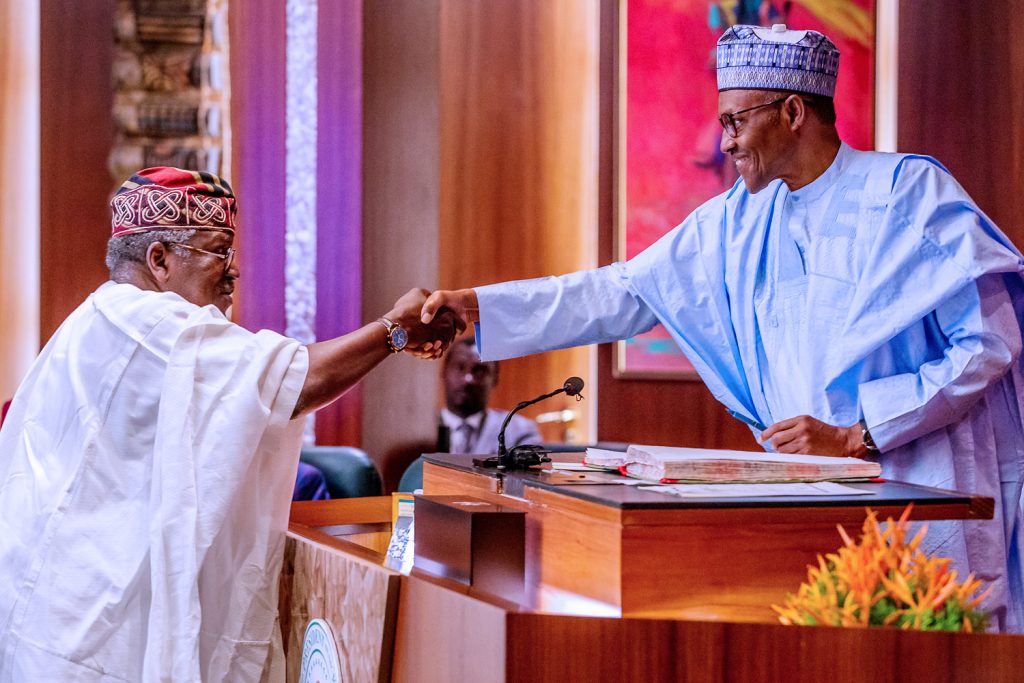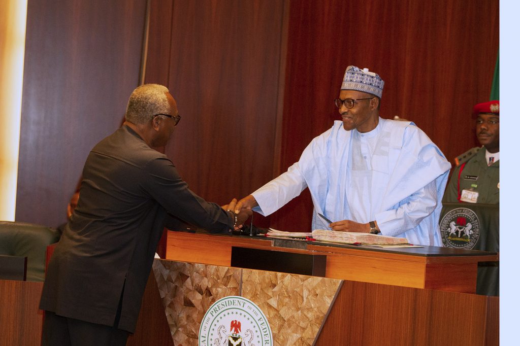 PRESIDENT BUHARI SWEAR-IN RMAFC MEMBERS 8. President Muhammadu Buhari in a handshake with the Chairman Revenue Mobilisation, Allocation and Fiscal Commission during the swearing-in of Chairman and Commissioner of the Commission held at the State House, Abuja. PHOTO; SUNDAY AGHAEZE. JUNE 27 2019