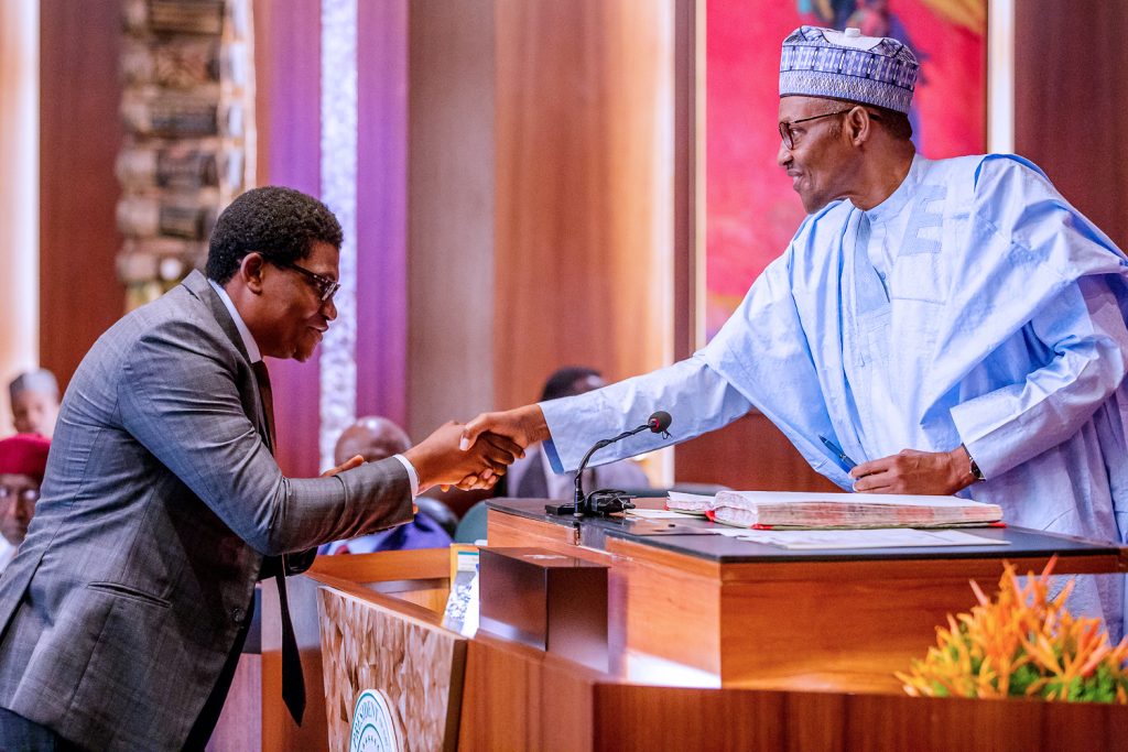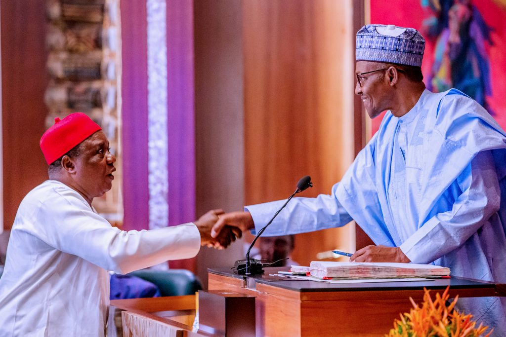 PRESIDENT BUHARI SWEAR-IN RMAFC MEMBERS 7. President Muhammadu Buhari in a handshake with the Commissioner representing Anambra for Revenue Mobilisation, Allocation and Fiscal Commission, Mr Chima Philip Okafor during the swearing-in of Chairman and Commissioner of the Commission held at the State House, Abuja. PHOTO; SUNDAY AGHAEZE. JUNE 27 2019