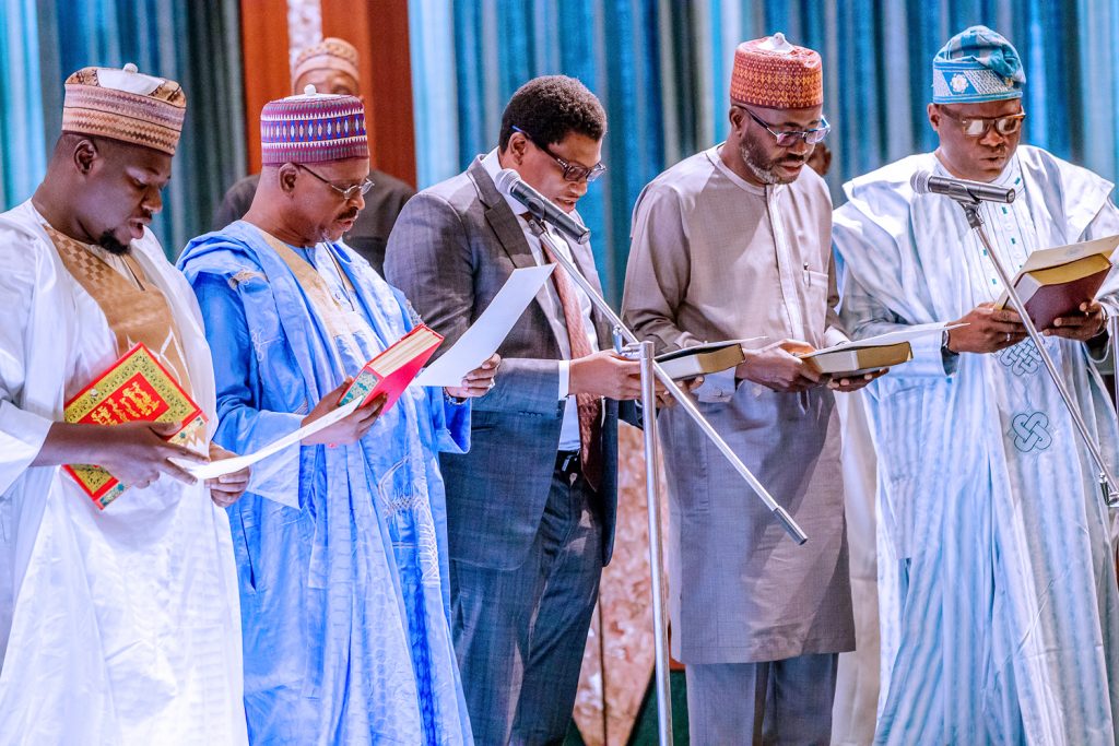 PRESIDENT BUHARI SWEAR-IN RMAFC MEMBERS 1. President Muhammadu Buhari (M) flanked by Chairman of the Revenue Mobilisation Allocation and Fiscal Commission, Engr Elias Mbam, Chief of Staff, Mallam Abba Kyari and others during the swearing-in of Chairman and Commissioner of the Commission held at the State House, Abuja. PHOTO; SUNDAY AGHAEZE. JUNE 27 2019
