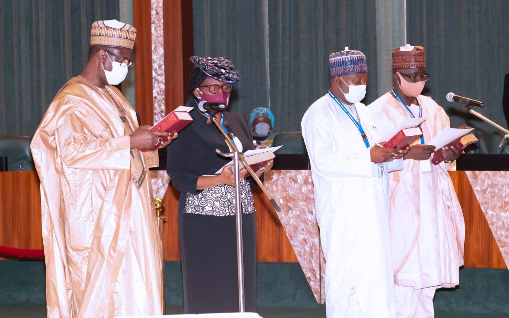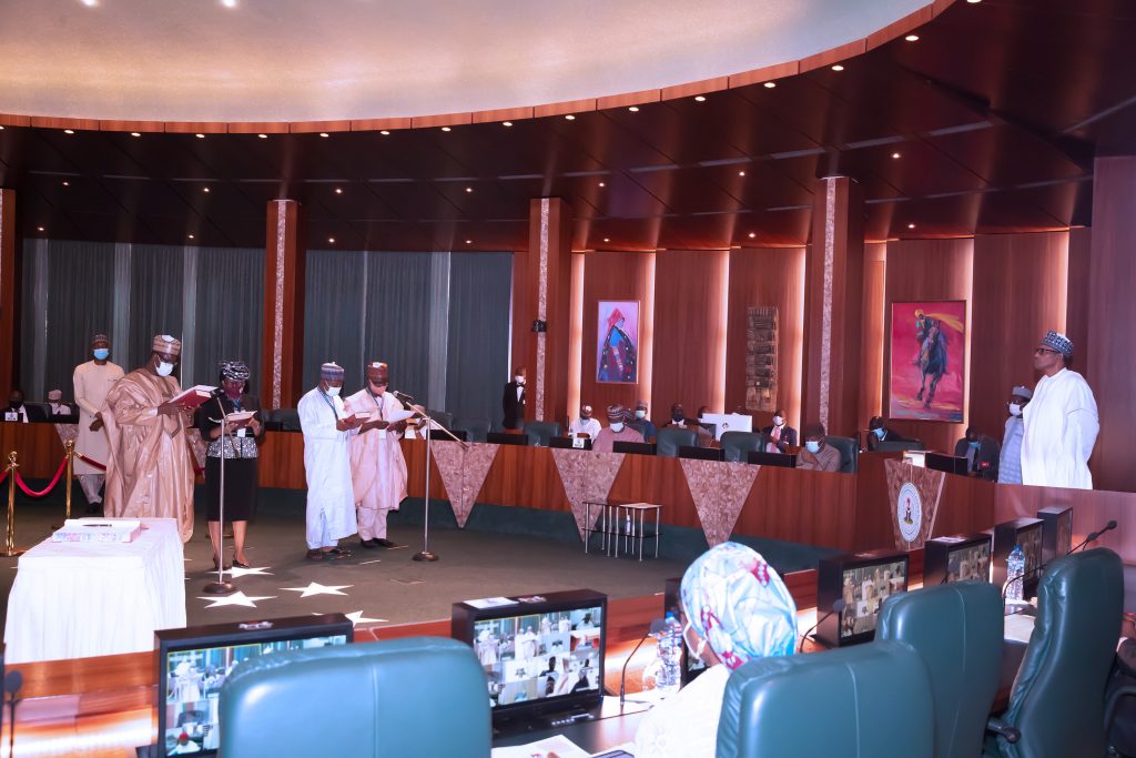 PRESIDENT BUHARI SWEARS IN 4 NEW PERM SEC 2. R-L; TAKING OF OATHS; President Muhammadu Buhari, The New Federal Permanent Secretaries, Mr James Sule, Mr Ismaila Abubakar, Mrs. Ibiene Patricia Roberts and Alhaji Shehu Aliyu Shinkafi during the swearing in Four new Permanent Secretaries held at the Council Chambers State House Abuja. PHOTO; SUNDAY AGHAEZE., SEPT 30 2020
