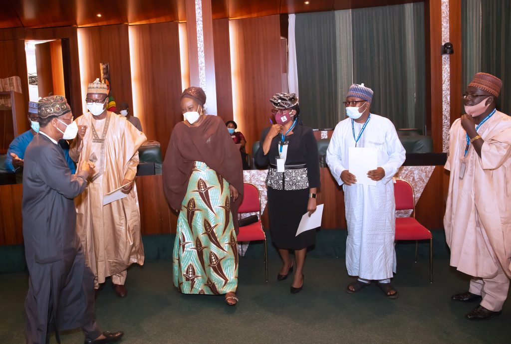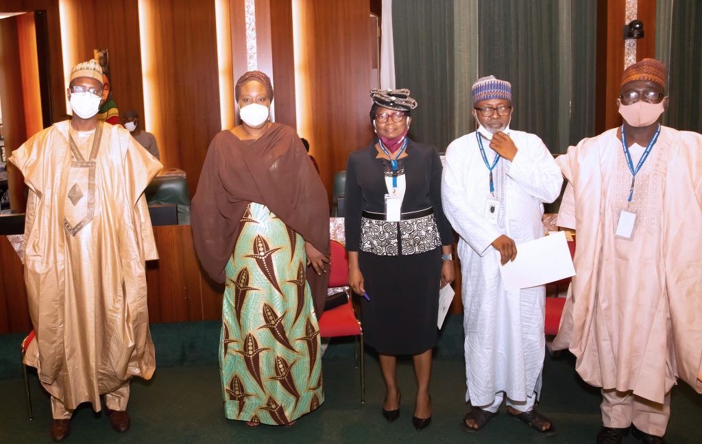 PRESIDENT BUHARI SWEARS IN 4 NEW PERM SEC 4. R-L; The New Federal Permanent Secretaries, Mr James Sule, Mr Ismaila Abubakar, Mrs. Ibien e Patricia Roberts, Heads of Civil Service of the Federal, Dr Folashade Yemi-Esan and Alhaji Shehu Aliyu Shinkafi as President Buhari Swears -in Four new Permanent Secretaries held at the Council Chambers State House Abuja. PHOTO; SUNDAY AGHAEZE., SEPT 30 2020