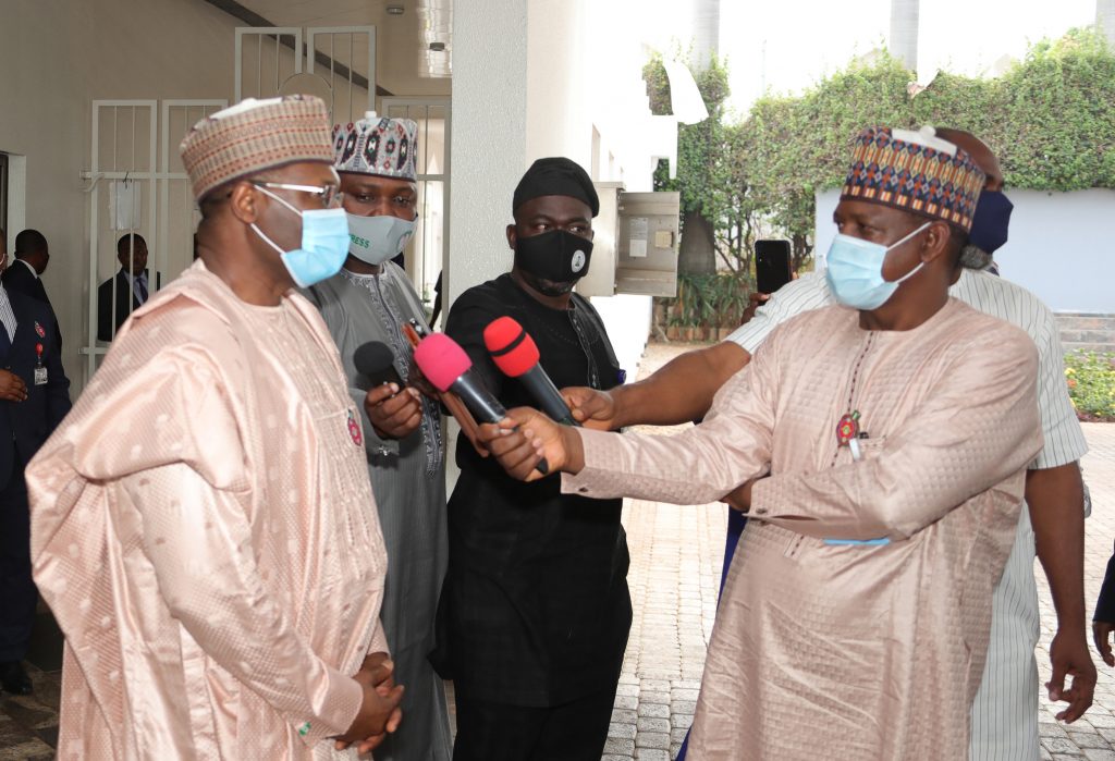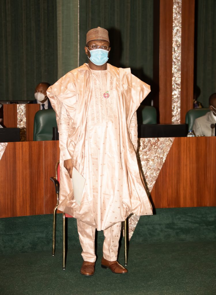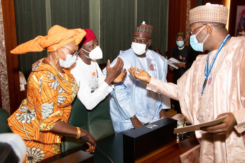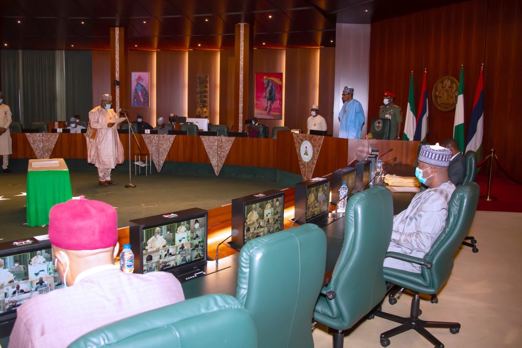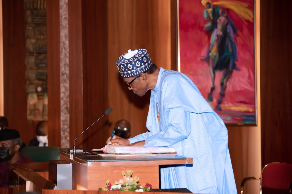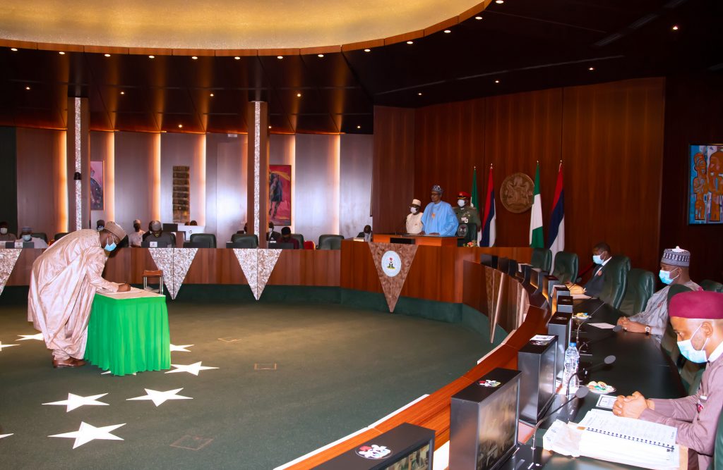 President Muhammadu Buhari swears-in The New Independent National Electoral Commission (INEC) Chairman Prof Mahmood Yakubu during the swearing in for a second term in office held at the Council Chambers, State House Abuja on Wednesday, December 9, 2020. PHOTO; SUNDAY AGHAEZE.
