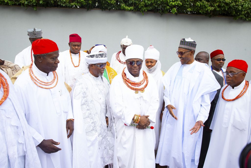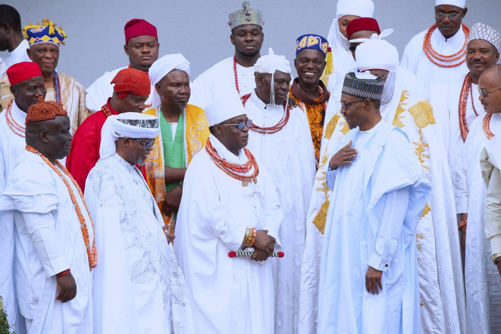 L-R; President Muhammadu Buhari, HRM Omo N’Oba N’Edo Uku Akpolokpolo, Oba Ewuare 11 Oba of Benin, Otaru of Auchi, HRH Alhaji Aliru H. Momoh (Ikelebe III), HRM Onojie of Orowa, Cyril Aidehoje, Esogban of Benin Kingdom Chief David Edehiri, Engogie of Evbuobanosa HRH Prince, Akenzua, Oliha of Benin Chief Edionwe Oliha and others Traditional rulers