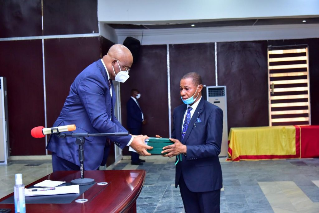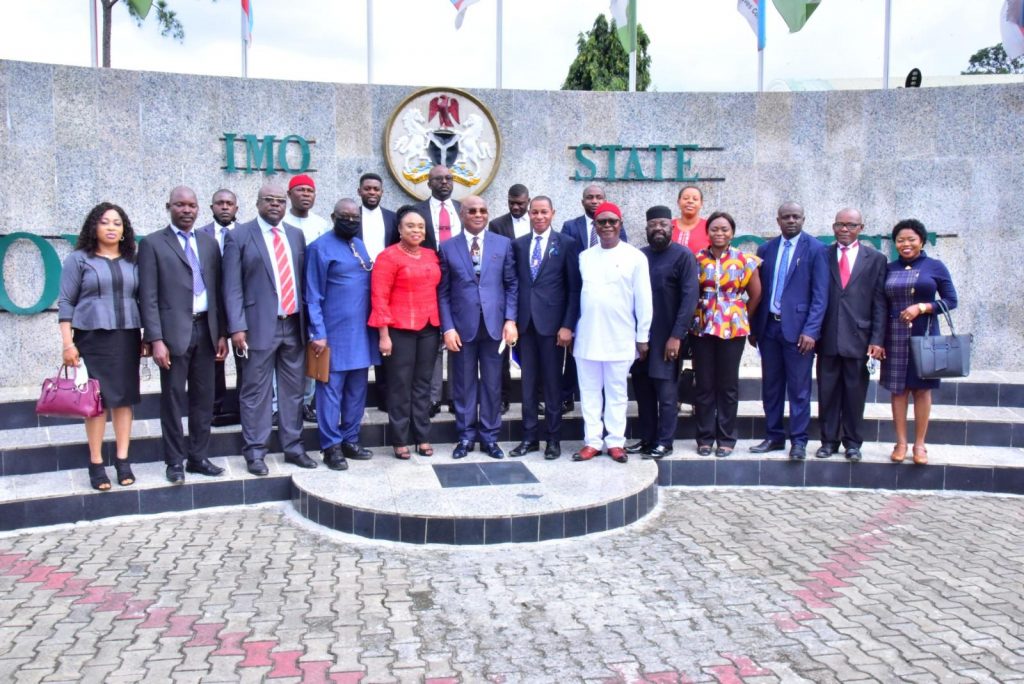 Governor Hope Uzodimma receives the Report of the Judicial Commission of Inquiry on Contracts Award in Imo State between 2006-2019 from it Chairman, Justice Benjamin C. Iheka at the Sam Mbakwe Exco Chambers, Owerri