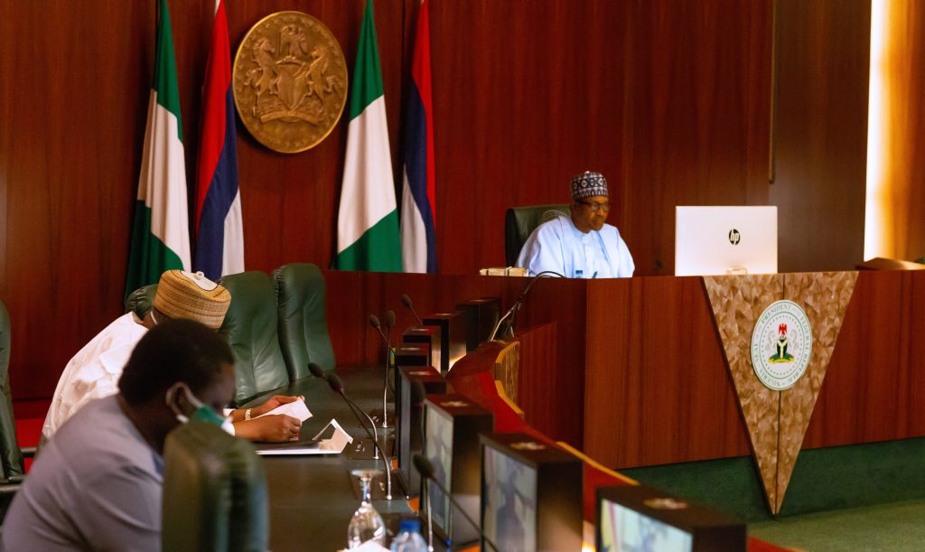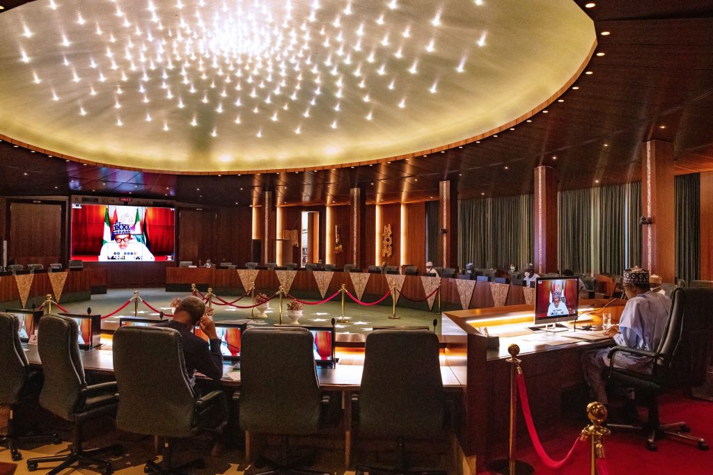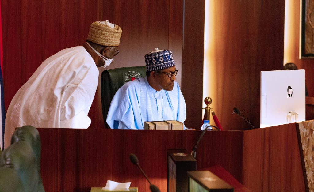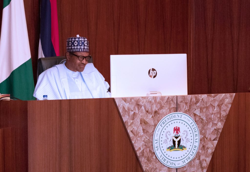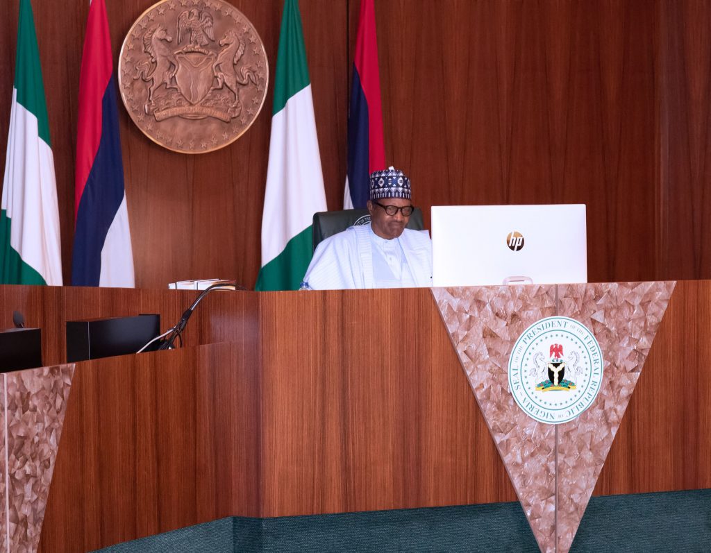 PRESIDENT BUHARI PARTICIPATES AT AN ONLINE HIGH LEVEL EVENT ON FINANCING FOR DEVELOPMENT IN COVID-19 ERA 00A President Muhammadu Buhari participates at the high level event on financing for development in the era of COVID-19 and beyond. PHOTO; SUNDAY AGHAEZE. MAY 28 2020