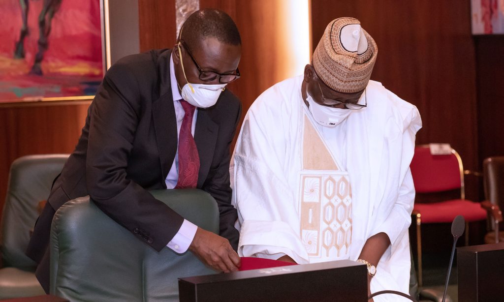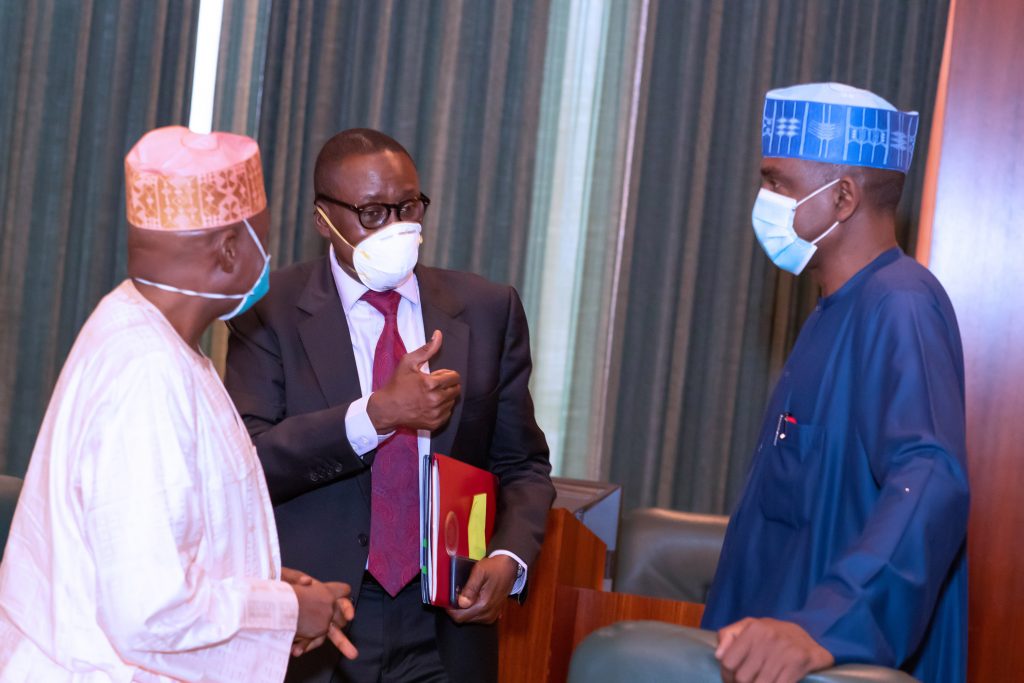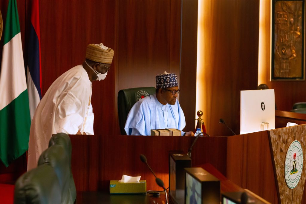 PRESIDENT BUHARI PARTICIPATES AT AN ONLINE HIGH LEVEL EVENT ON FINANCING FOR DEVELOPMENT IN COVID-19 ERA 4. L-R; President Muhammadu Buhari, Minister of Foreign Affairs, Geoffrey Onyeama, Minister of Finance, Hajiya Zainab Ahmed as President participates at the high level event on financing for development in the era of COVID-19 and beyond. PHOTO; SUNDAY AGHAEZE. MAY 28 2020