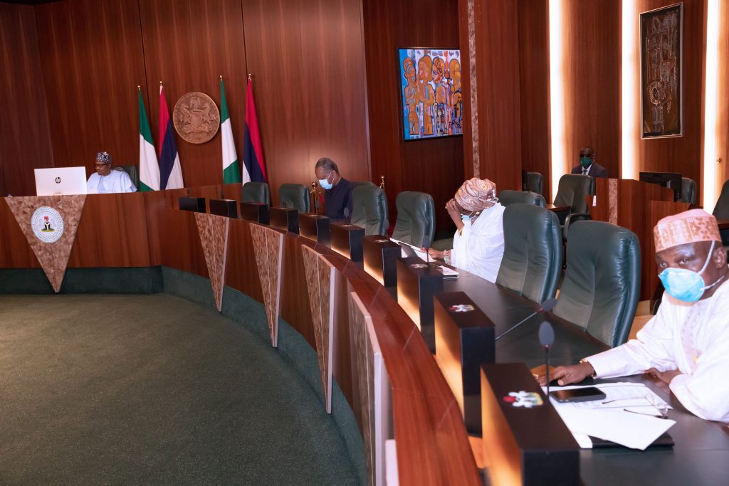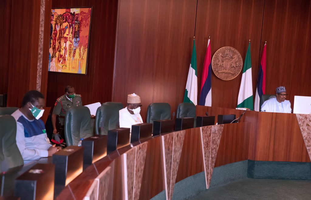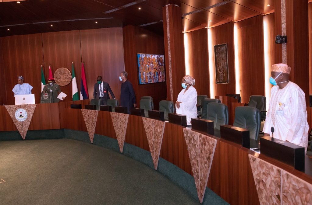 PRESIDENT BUHARI PARTICIPATES AT AN ONLINE HIGH LEVEL EVENT ON FINANCING FOR DEVELOPMENT IN COVID-19 ERA 6. L-R; President Muhammadu Buhari, Minister of Foreign Affairs, Geoffrey Onyeama, Minister of Finance, Hajiya Zainab Ahmed and SSAP Media and Publicity, Mallam Shehu Garba as President participates at the high level event on financing for development in the era of COVID-19 and beyond. PHOTO; SUNDAY AGHAEZE. MAY 28 2020