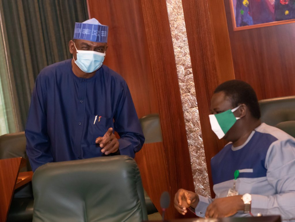 PRESIDENT BUHARI PARTICIPATES AT AN ONLINE HIGH LEVEL EVENT ON FINANCING FOR DEVELOPMENT IN COVID-19 ERA 8. L-R; SA Media and Publicity Mr Femi Adesina and Permanent Secretary State House, Alhaji Alh Tijjani Idris Umar as President Muhammadu Buhari participates at the high level event on financing for development in the era of COVID-19 and beyond. PHOTO; SUNDAY AGHAEZE. MAY 28 2020
