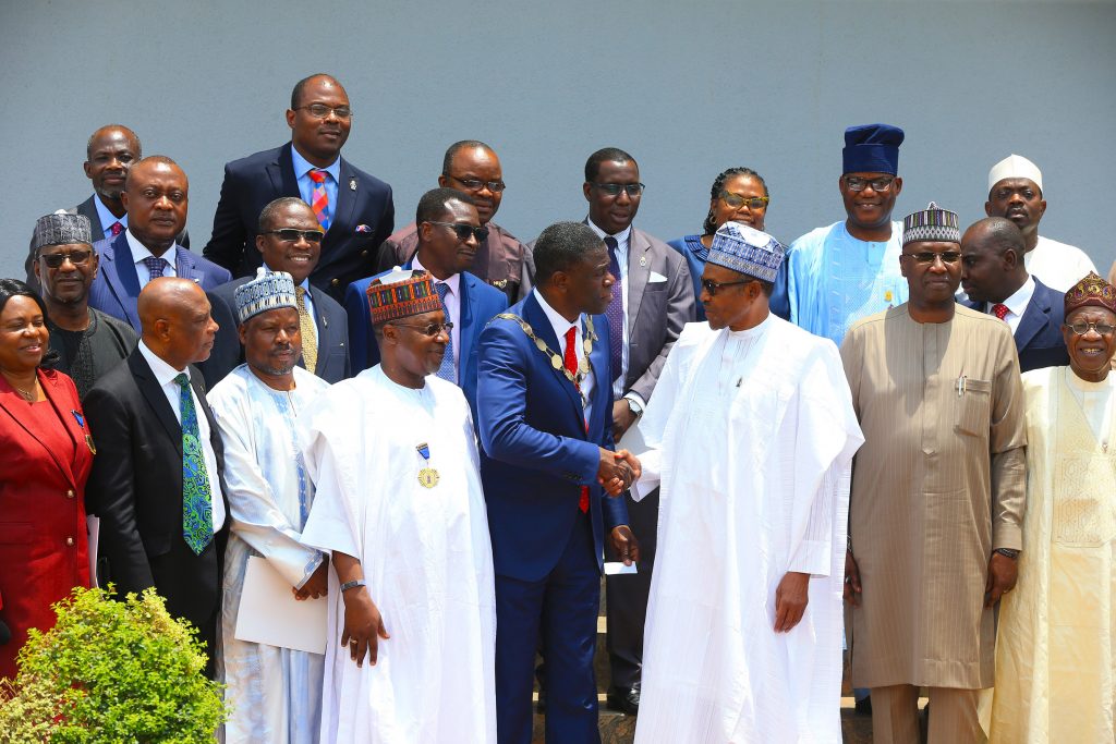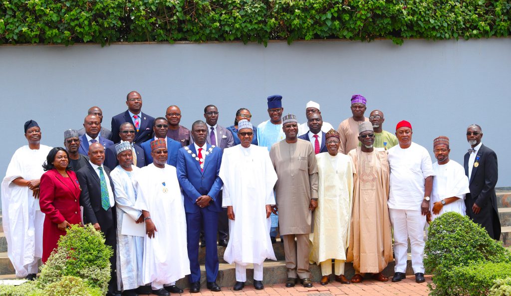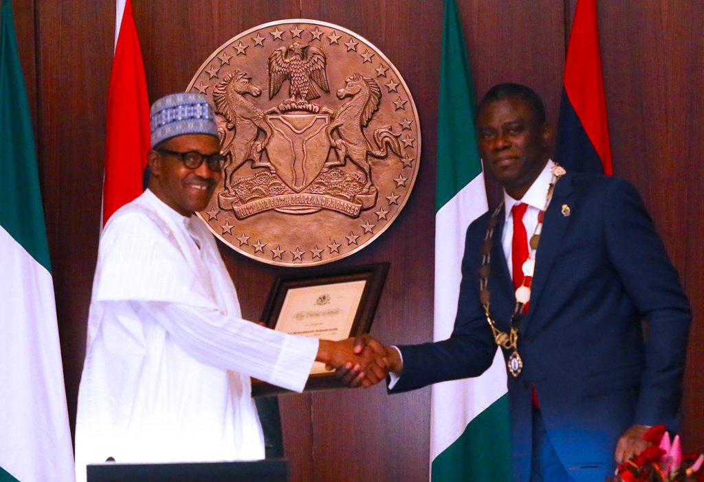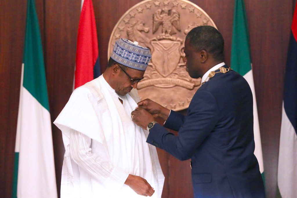 President Muhammadu Buhari being conferred with the Fellowship Grade of the NIQS – the highest cadre of membership by The Nigerian Institute of Quantity Surveyors President, Obafemi Onashile