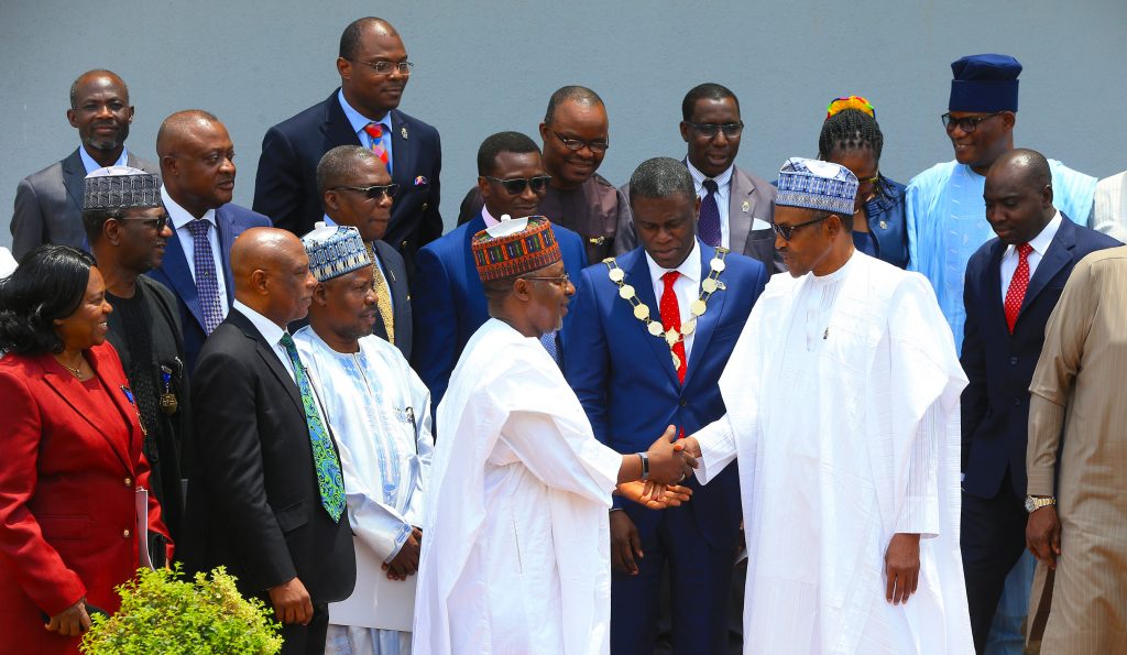 L-R; President Muhammadu Buhari, The Nigerian Institute of Quantity Surveyors President, Obafemi Onashile, Casle President, QS Joseph Ajanlekoko, Former Minister of State for Power and Steel and Members QS, Muritala Aliyu, Past President Husaini Dikko, Past President of QS Felix A. Okereke-Onyeri, Past President Agele Alufohai, Immediate Past President of QS Mercy Iyortyer, Deputy President of QS Abba Tor, Vice President of QS Olayemi Shonubi, Secretary General of QS Oyinleye Adebowale among others