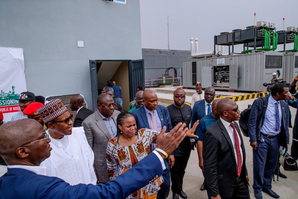 President Buhari with Governor Rochas Okorochas of Imo State, MD Rural Electrification Agency Damilola Ogunbiyi, Governor Okezie Ikpeazu of Abia State and Minister of Power, Works and Housing Babatunde Fashola as he commissions Ariaria Market Independent Power Project in Abia State on Tuesday, January 29, 2019.
