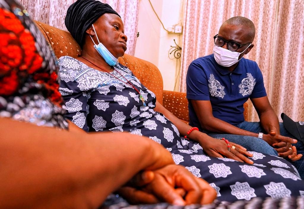 Lagos State Governor, Mr. Babajide Sanwo-Olu (right), condoling with widow of Okechukwu Iloamuazor, who was hit by a stray bullet in the Surulere EndSARS protest