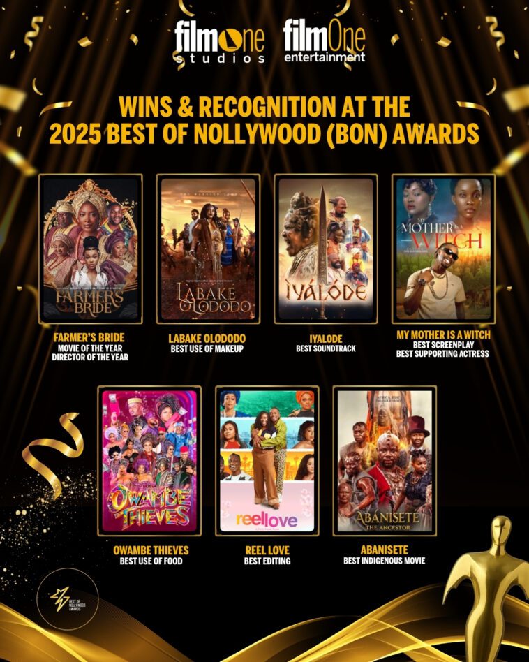 While official listings from the Best of Nollywood (BON) 2025 show a spread of winners across various productions, FilmOne Entertainment’s slate was widely recognised in multiple categories, underscoring the company’s role in driving quality filmmaking and promoting diverse narratives to audiences.