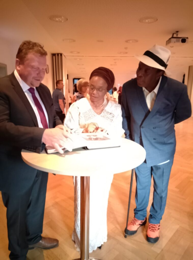At the high octane and star studded opening of “From Heaven to Hell” exhibition of paintings, Honorable Minister for Culture, Information incharge of the Affairs of the Nigerian Embassy Berlin, came all the way from Berlin, accompanied by the first Secretary, Mr Adebayor, Honourable Minister Mrs. Chioma Aisha Okorie – Haidara and Emmanuel Eni as they sign into the golden book of the town of Schwarzenbach am Wald where the exhibition was held, with the first Mayor of the the town Mr. Reiner Feulner.