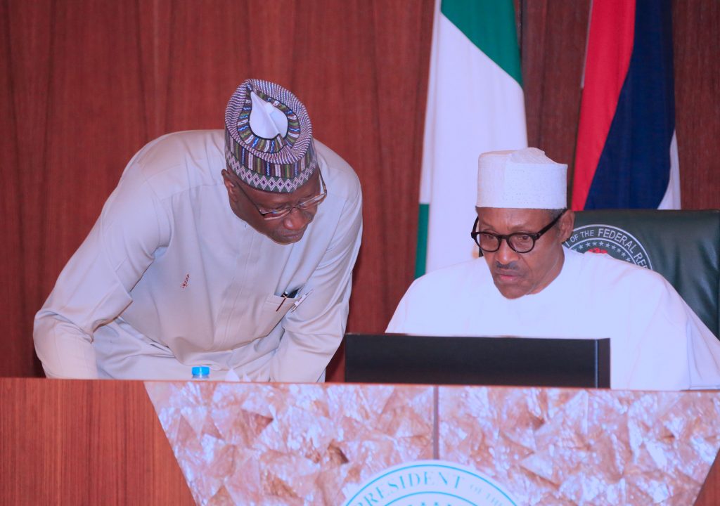 President Muhammadu Buhari confers with the SGF Mr Boss Mustapha
