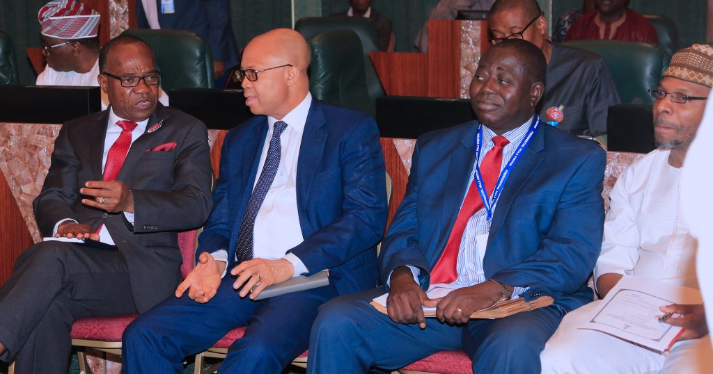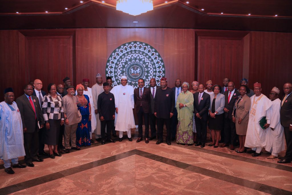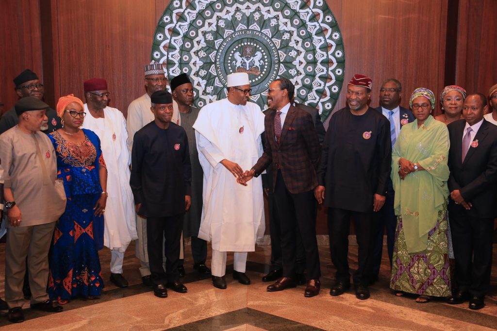 L-R; President Muhammadu Buhari (M) Flanked by the Vice President Yemi Osinbajo SAN, Chairman of the Minimum Wage Committee, Mr Bismarck Rewane, other members of the Committee are Former Suleiman Baru, Dr Ayo Teriba Former Chairman FIRS, Mrs Ifueko Omoigu-Okaru, Accountant General of the Federation, Alh Ahmed Idris, FIRS Chairman, Dr Babatunde Fowler, DG DMO, Mrs Patience Oniha DG Budget of the Federation Mr Ben Akabueze, DG National Bureau of Statistics, Dr Yemi Kale, Deputy CBN Governor, Mr Joseph Nnanna, Tunde Lawal