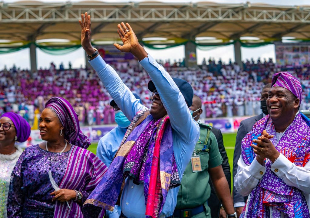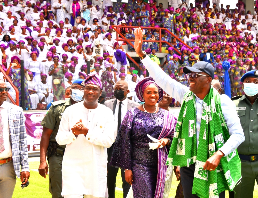 Lagos State Governor, Mr. Babajide Sanwo-Olu (middle) acknowledging cheers from women, Deputy Governor, Dr. Obafemi Hamzat (right) and Commissioner for Women Affairs and Poverty Alleviation (WAPA), Mrs. Bolaji Dada (left)