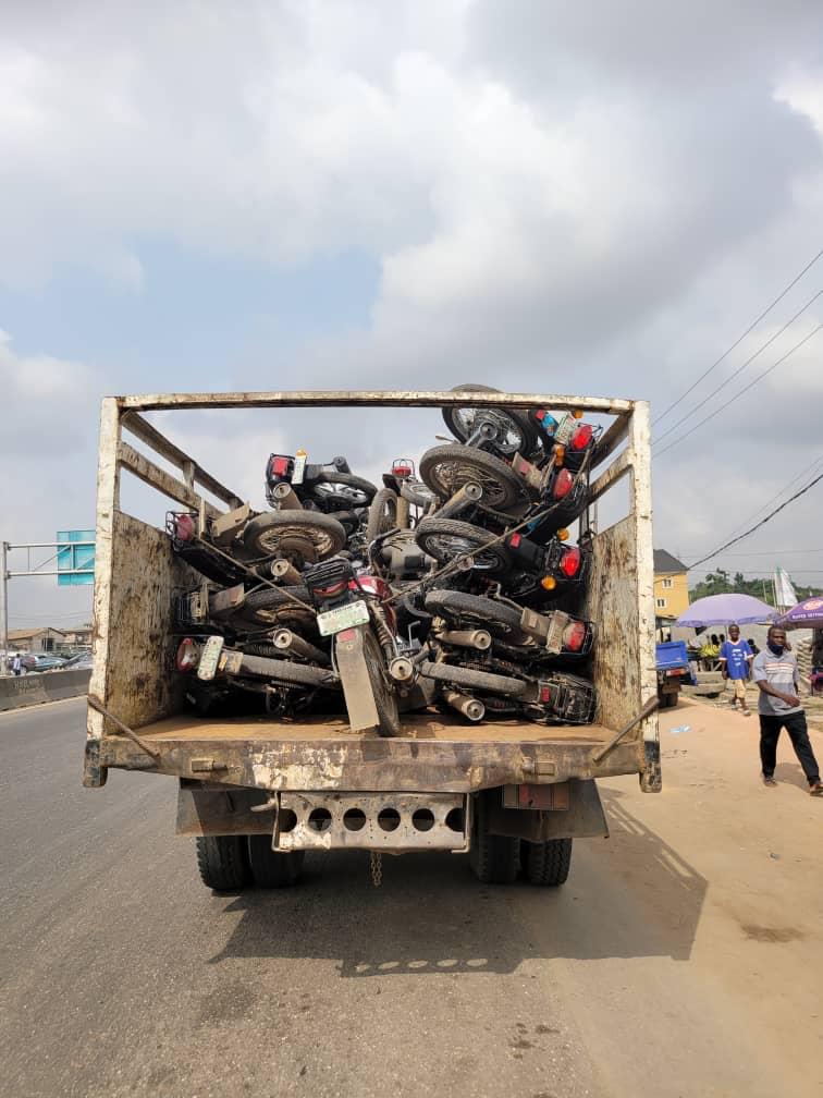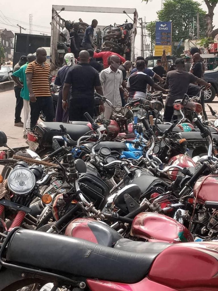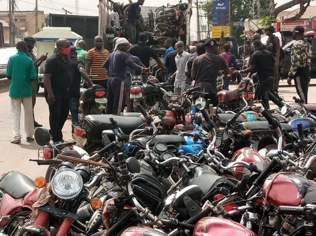 No fewer than 130 commercial motorcycles, popularly known as Okada, that are operating on highways and in other restricted areas in Lagos State have been impounded on Monday in an enforcement carried out by the Lagos State Environmental Sanitation Enforcement Agency (Taskforce).