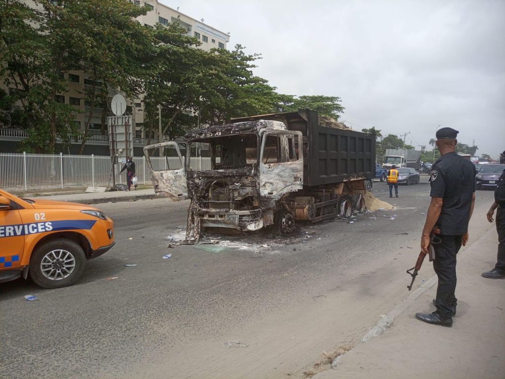 Speaking on the incidents , the Chairman of the Lagos State Taskforce,CSP Shola Jejeloye said that the avoidable unrest occurred as a result of accident involving a truck and motorcycle at about 12 noon today leaving the rider of the Motorcycle dead while one passenger was injured. Eye witnesses at the scene of the incident claimed that the rider drove against traffic before being rammed into by the moving truck, leading to passers by and miscreants setting the truck ablaze, causing commotion and transfer of aggression by the miscreants and hoodlums to innocent citizens along that axis.