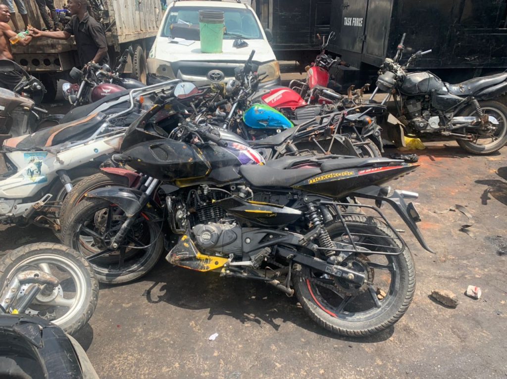 “We have made a series of arrests of dispatch bikes whose riders either convey passengers even with the delivery box still mounted on the bike or sometimes disassemble the box and convey the passengers with the bikes. Unfortunately, some of the owners of these bikes do not know that their bikes have been confiscated because the riders usually abandon the bikes once apprehended by our officers”.