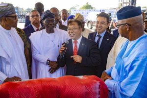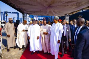 At the commissioning of the Lekki Deep Sea Port, the President led Governor Babajide Sanwo-Olu of Lagos State, the Minister of Transportation, Muazu Sambo, the Chinese Ambassador to Nigeria, Ciu Jianchun, top government officials and traditional rulers, to witness the overloading from the Container Ship, sailing under the flag of Malta.