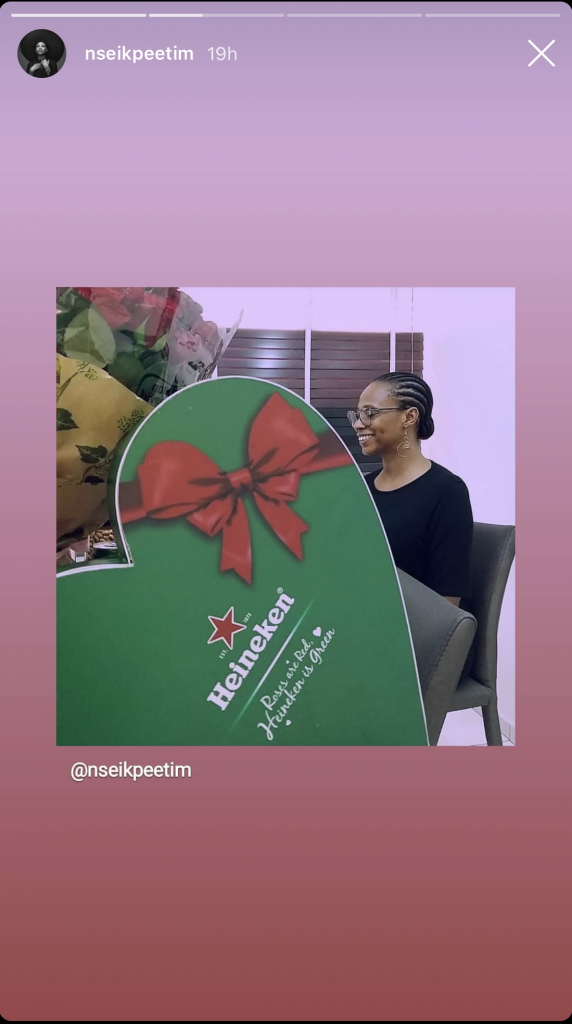 As seen by the social media posts by Nse Ikpe Etim, the actress was elated to receive the bouquet of followers and the special Heineken box which contained the new sleek cans.