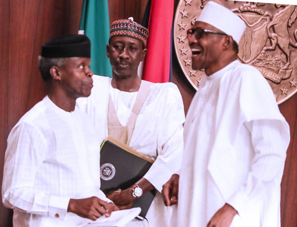 President Muhammadu Buhari Chats with Vice President Yemi Osinbajo SAN and NSA Major-General Babgana Monguno