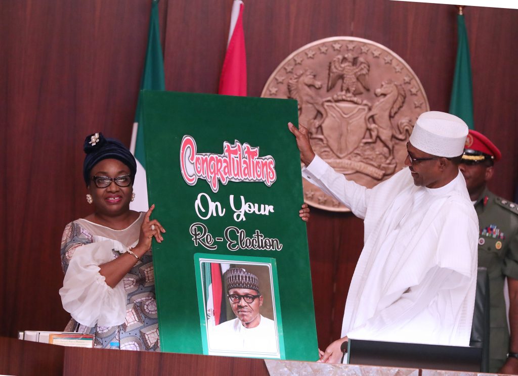 President Muhammadu Buhari Receives Congratulatory Card from the Head of Civil Service of the Federation, Mrs. Winifred Oyo-Ita