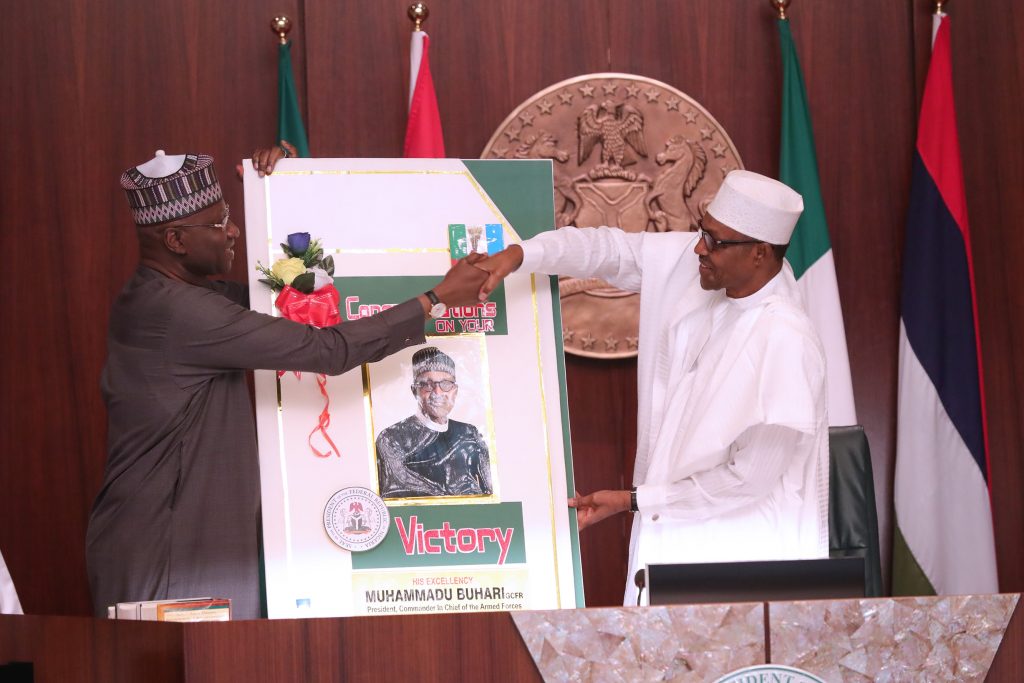 President Muhammadu Buhari Receives Congratulatory Card from the SGF, Mr. Boss Mustapha on behalf of the Cabinet Members