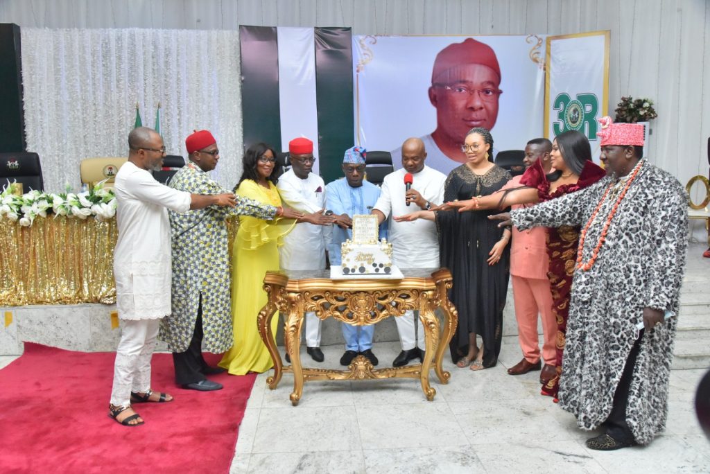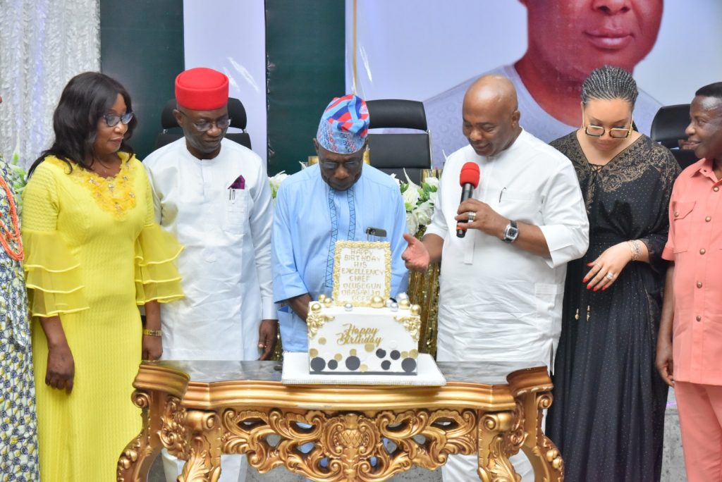 Obasanjo was assisted to cut the cake by the Governor’s wife, Barr. Mrs. Chioma Uzodimma, Deputy Governor of Imo State, Prof Placid Njoku and his wife, Dr. Bola Njoku, Speaker of the House of Assembly, Rt. Hon Kennedy Ibe, former Governor of Imo State, Dr. Ikedi Ohakim, Chaiman of Imo State Elders Council, HRH Eze Dr. Cletus Ilomuanya, Chairman of Imo State Council of traditional rulers, Eze Dr. EC Okeke among others while the Governor moderated the cutting.