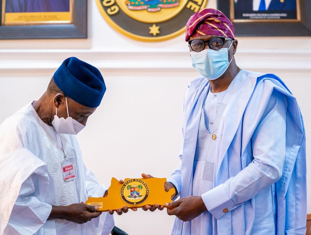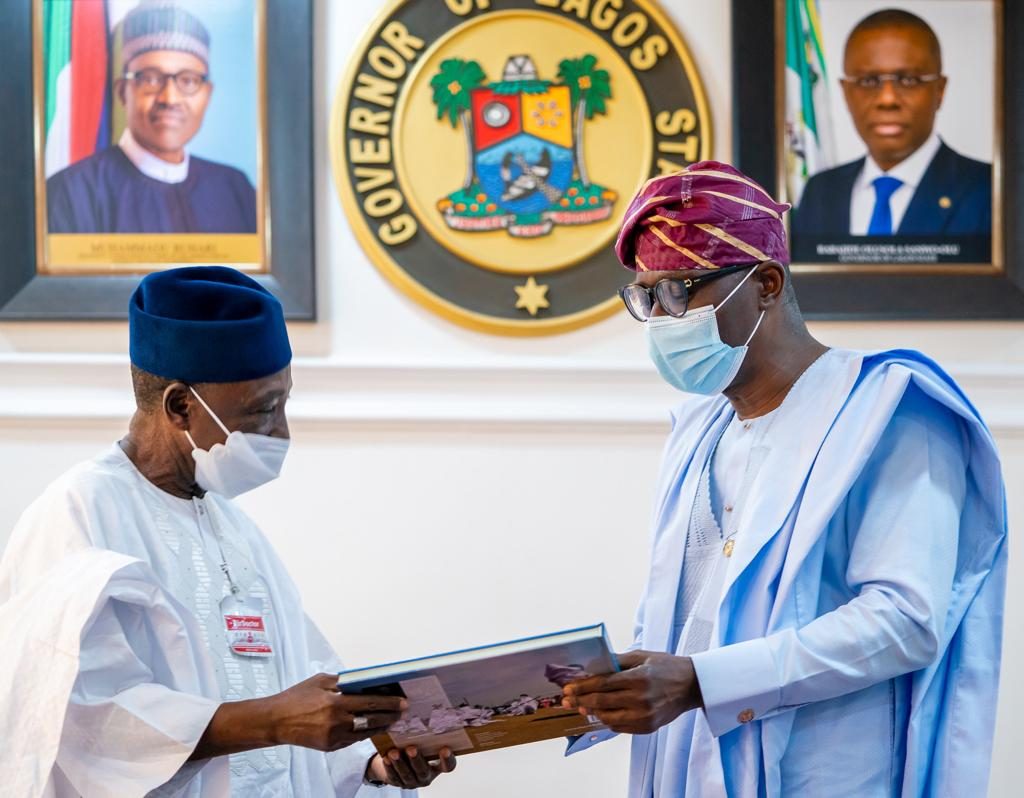 R-L: Lagos State Governor, Mr. Babajide Sanwo-Olu, presents a compendium on Lagos to the Minister of Agriculture and Rural Development, Alhaji Sabo Nanono