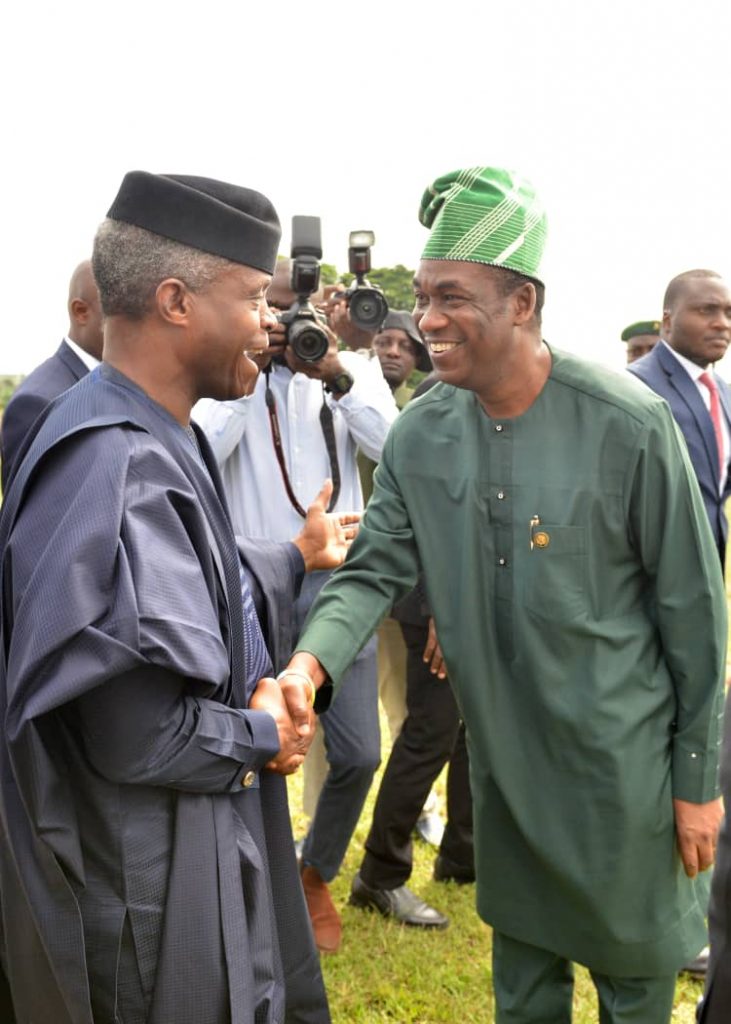 Representative of Lagos State Governor and Deputy Governor, Dr. Obafemi Hamzat (right), welcoming the Vice President, Prof. Yemi Osinbajo