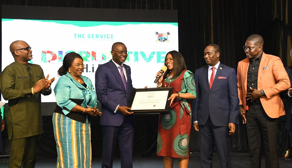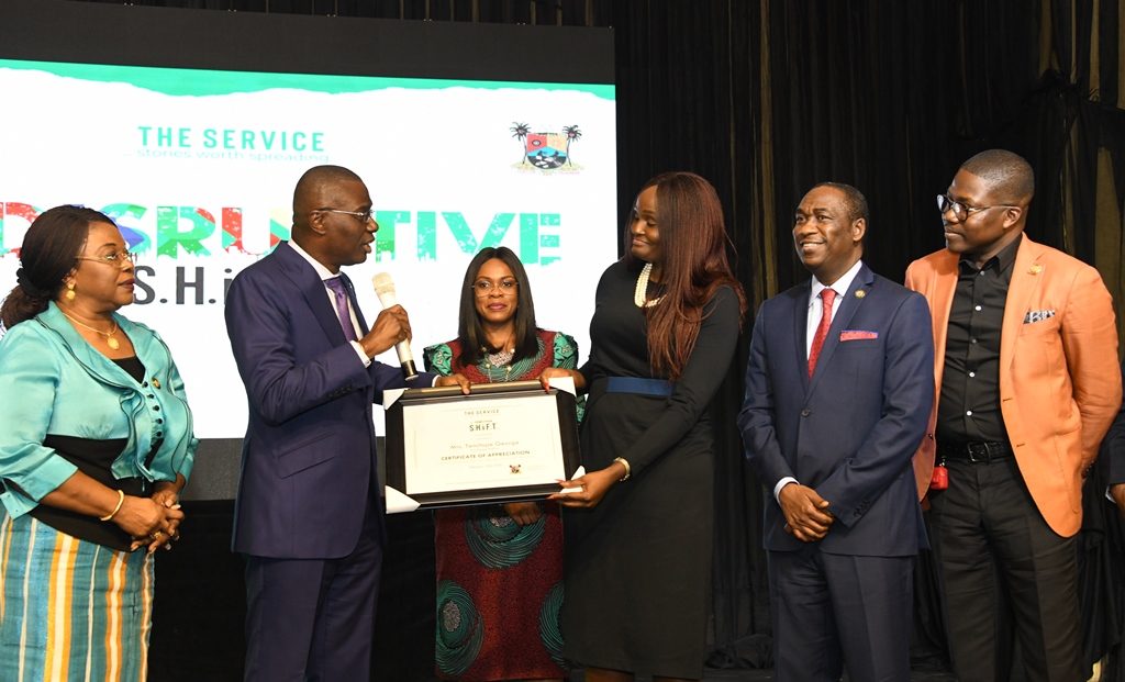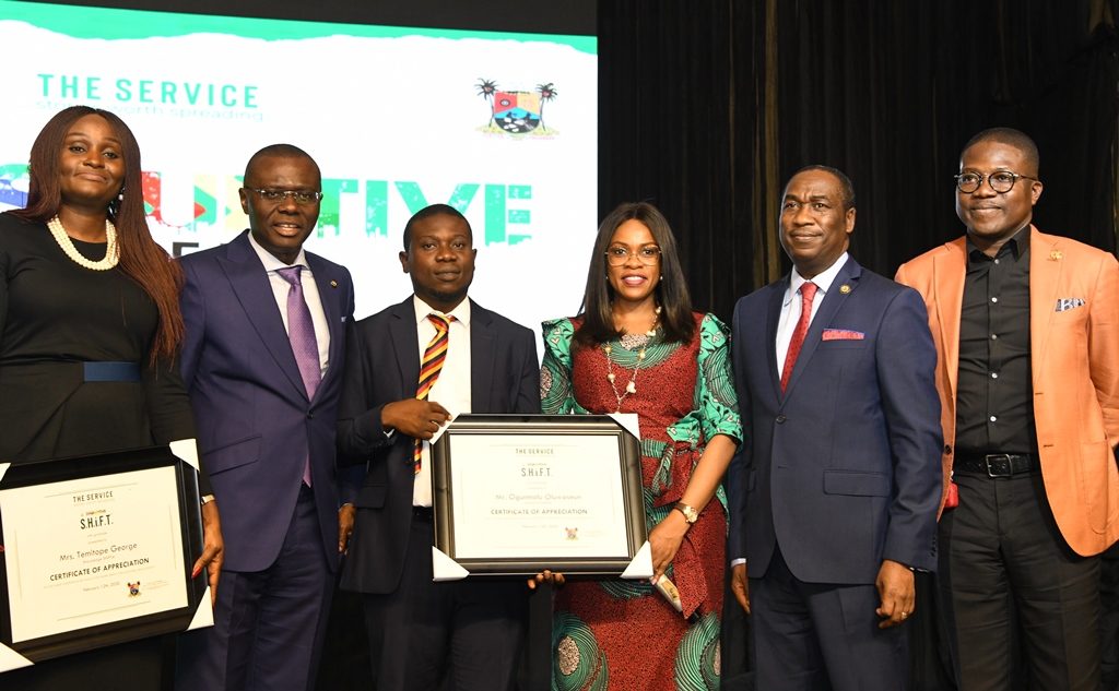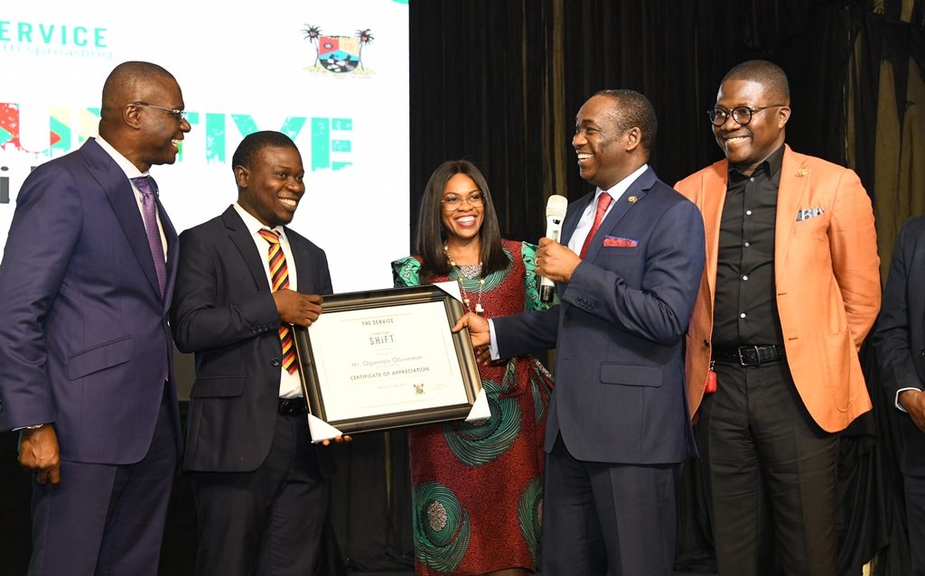 L-R: Knowledge SHiFTER, Mrs. Temitope George; Lagos State Governor, Mr. Babajide Sanwo-Olu; Innovator SHiFTER, Mr. Ogunmolu Oluwaseun; Commissioner for Establishments, Training and Pensions, Mrs. Ajibola Ponnle; Deputy Governor, Dr. Obafemi Hamzat and Head of Service, Mr. Hakeem Muri-Okunola