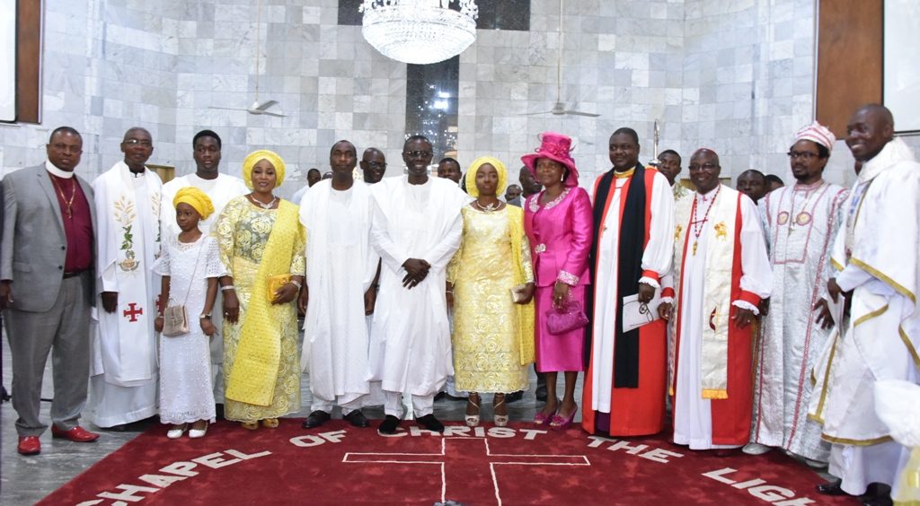 Lagos State Governor, Mr. Babajide Sanwo-Olu (6th left); his wife, Dr. Ibijoke (6th right); Deputy Governor, Dr. Obafemi Hamzat (5th left); his wife, Oluremi (4th left); Presiding Chaplain, Chapel of Christ The Light, Alausa, The Very Rev. Ayo Olu Oyadotun (right);Bishop of Lagos West Anglican Communion, Rt. Rev. Sola Odedeji (4th right) and others