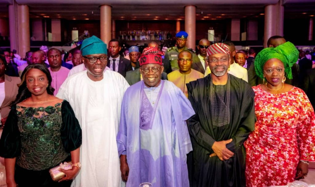L-R: Wife of Lagos State Governor, Dr. (Mrs) Ibijoke Sanwo-Olu; Governor Babajide Sanwo-Olu; National Leader, All Progressives Congress (APC), Asiwaju Bola Ahmed Tinubu; Speaker, House of Representatives, Rt. Hon. Femi Gbajabiamila and his wife, Salamot