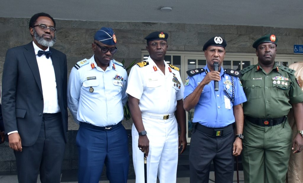 L-R: Lagos State Attorney General and Commissioner for Justice, Mr. Moyo Onigbanjo, SAN; Commander, 651Base Services Group, Ikeja, Air Commodore Sunday Makinde; Commander, Nigeria Navy Ship (NNS) Beecroft, Apapa, Commodore Ibrahim Aliyu; State Commissioner of Police, Mr. Zubairu Muazu and Commander, 9 Brigade, Ikeja Army Cantonment, Brigadier General Etsu Ndagi