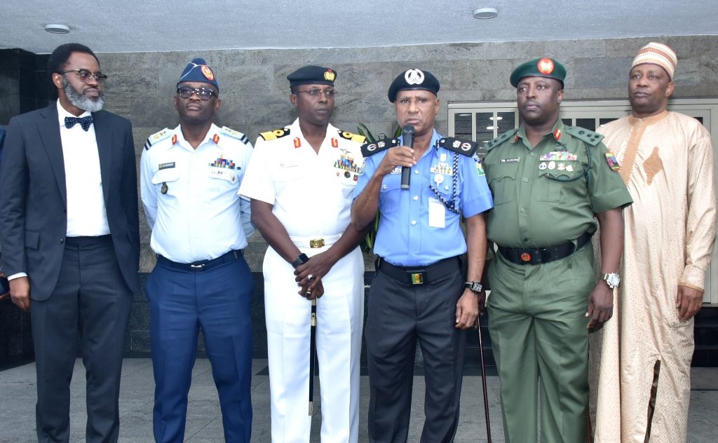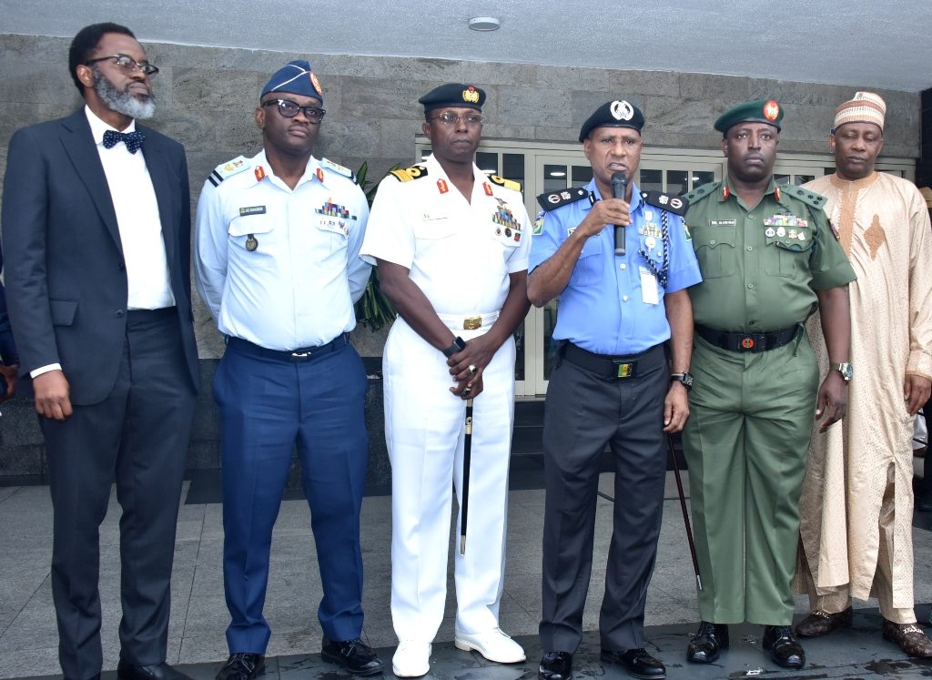 L-R: Lagos State Attorney General and Commissioner for Justice, Mr. Moyo Onigbanjo, SAN; Commander, 651Base Services Group, Ikeja, Air Commodore Sunday Makinde; Commander, Nigeria Navy Ship (NNS) Beecroft, Apapa, Commodore Ibrahim Aliyu; State Commissioner of Police, Mr. Zubairu Muazu; Commander, 9 Brigade, Ikeja Army Cantonment, Brigadier General Etsu Ndagi and Director, Department of Security Service(DSS), Mr. Abdulfatai Sanusi