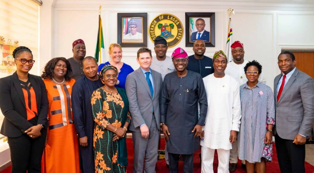 Lagos State Governor, Mr. Babajide Sanwo-Olu (4th right); his Deputy, Dr. Obafemi Hamzat (3rd right); President, Global Growth and Opportunity, Bill and Melinda Gates Foundation, Mr. Roger Voorhies (middle); Secretary to the State Government, Mrs. Folasade Jaji (4th left) and others