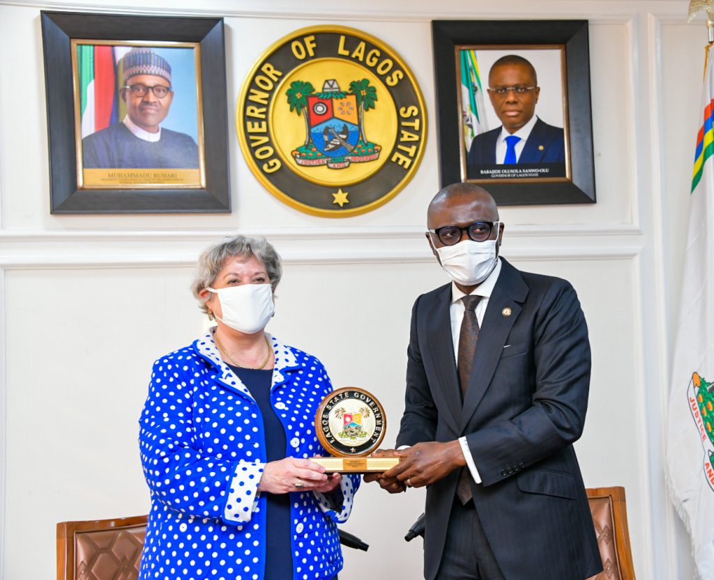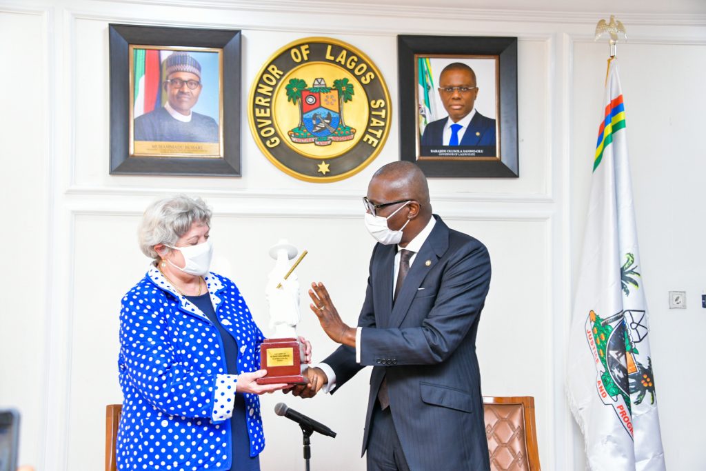 Lagos State Governor, Mr. Babajide Sanwo-Olu (right) presenting a plaque to the United States Ambassador to Nigeria, Mary Beth Leonard