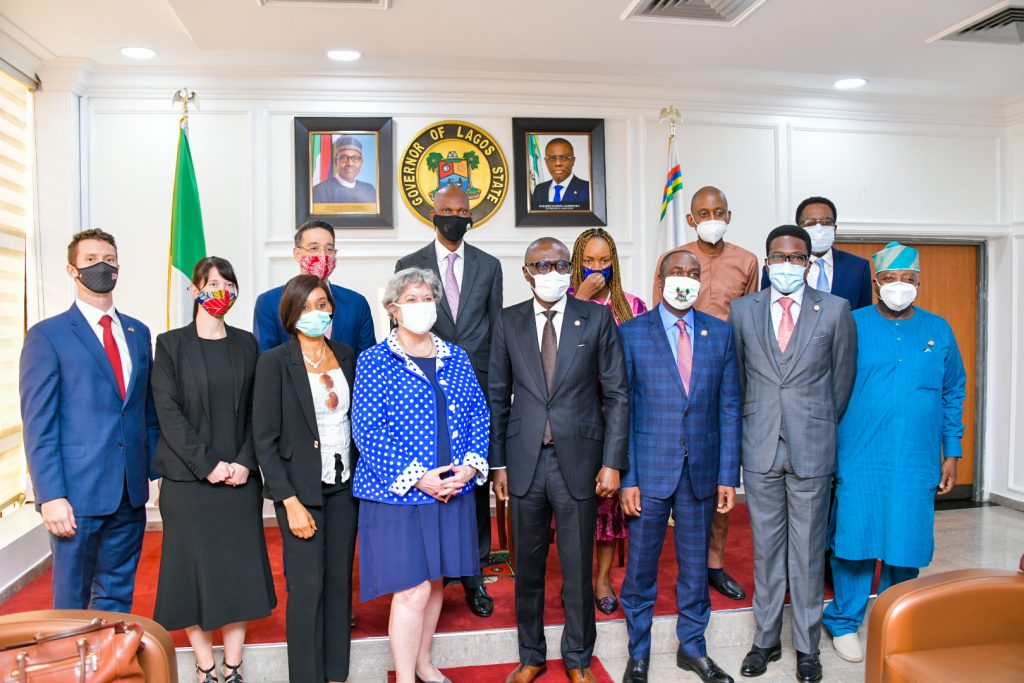 Lagos State Governor, Mr. Babajide Sanwo-Olu (4th right) flanked by United States Ambassador to Nigeria, Mary Beth Leonard (4th left); Lagos Deputy Governor, Dr. Obafemi Hamzat (3rd right) and others
