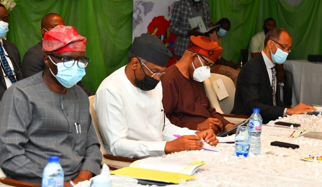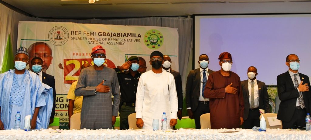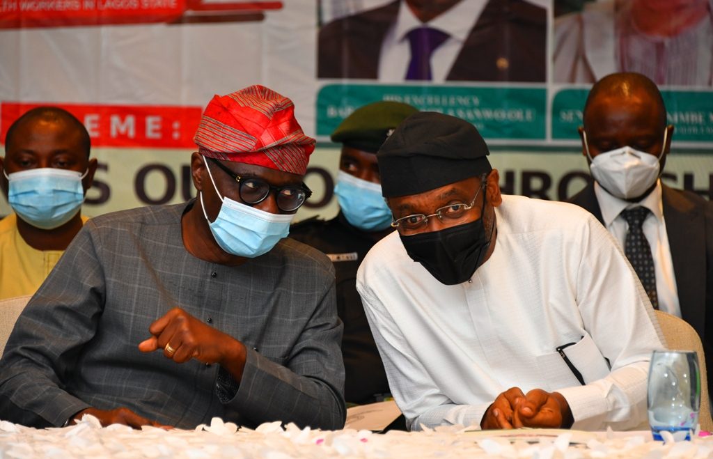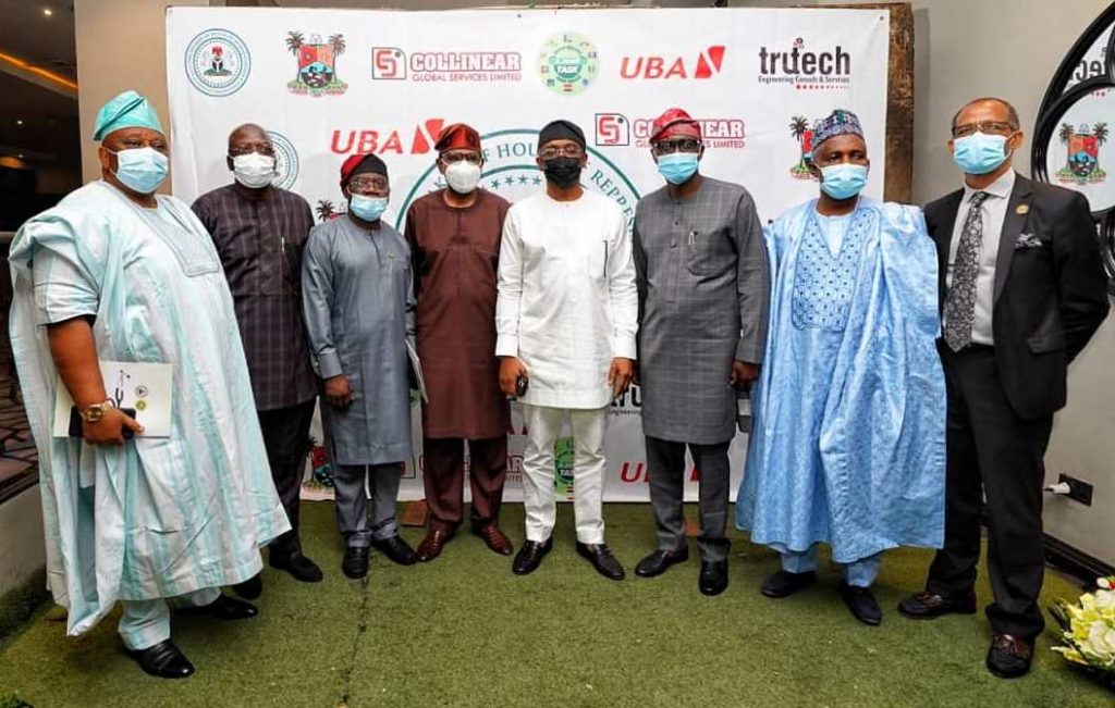 L-R: Member, House of Representatives (HoR), Dr. Samuel Adejare; Chairman, House Committee on SDGs, Hon. Rotimi Agunsoye; President, Nigeria Medical Association (NMA), Professor Innocent Ujah; Minister of State for Health, Dr. Olorunnimbe Mamora; the Speaker, HoR, Rt. Hon. Femi Gbajabiamila; Lagos State Governor, Mr. Babajide Sanwo-Olu; Chairman, House Committee on Health, Dr. Tanko Sununu and Lagos Commissioner for Health, Prof. Akin Abayomi