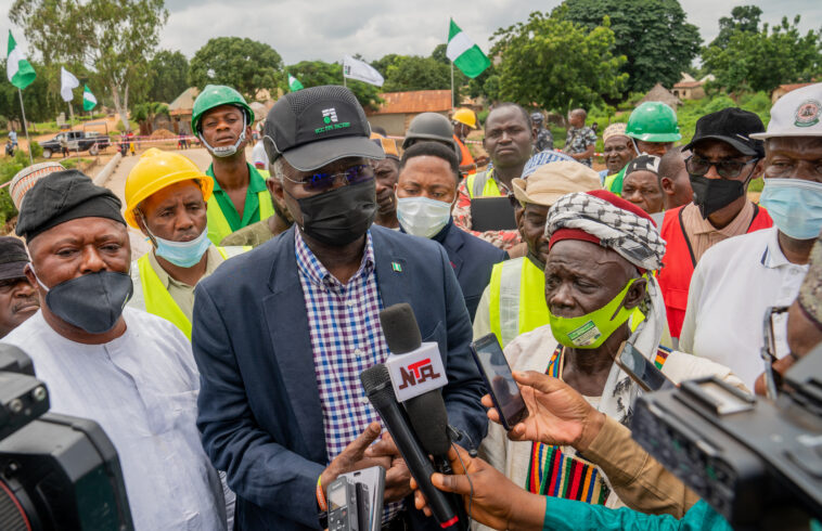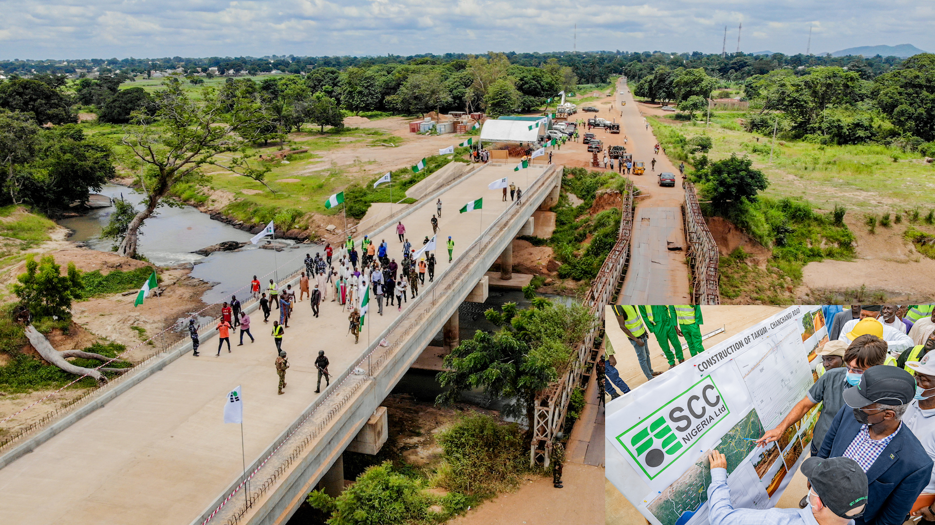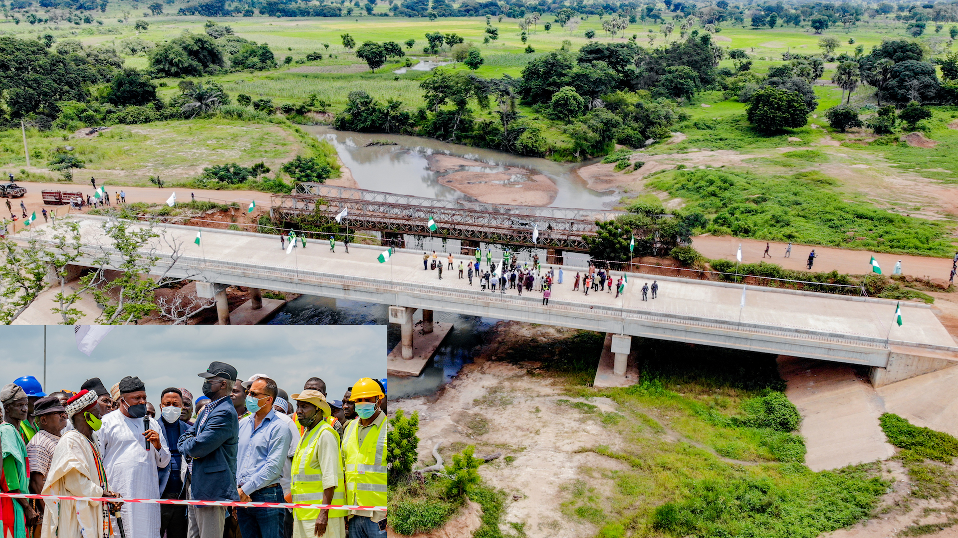 During the inspection of the new Chanchanji Bridge along Takum – Wukari Road in Taraba State on Thursday, 12th August 2021. Beside the new Bridge is the old, pre-Independence Bailey Bridge.