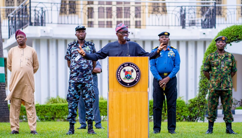 Lagos State Governor, Mr. Babajide Sanwo-Olu. With him (L-R): Commander, 9 brigade, Ikeja Army Cantonment, Brigadier General Etsu Ndagi; Director, Department of Security Service (DSS), Mr. Abdulfatai Sanusi; Commissioner of Police, Lagos Command, Mr. Hakeem Odumosu; Commander, Nigeria Navy Ship (NNS) Beecroft, Apapa, Commodore Ibrahim Aliyu Shettima and commander, 651 Base Services Group, Nigerian Air Force Base, Ikeja, Air Commodore Rasaq Olanrewaju.