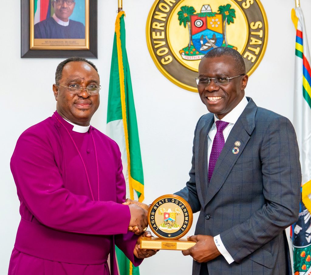 L-R: Diocesan Bishop of Lagos, Rt. Rev. Humphrey Olumakaiye, presents a souvenir to Lagos State Governor, Mr. Babajide Sanwo-Olu